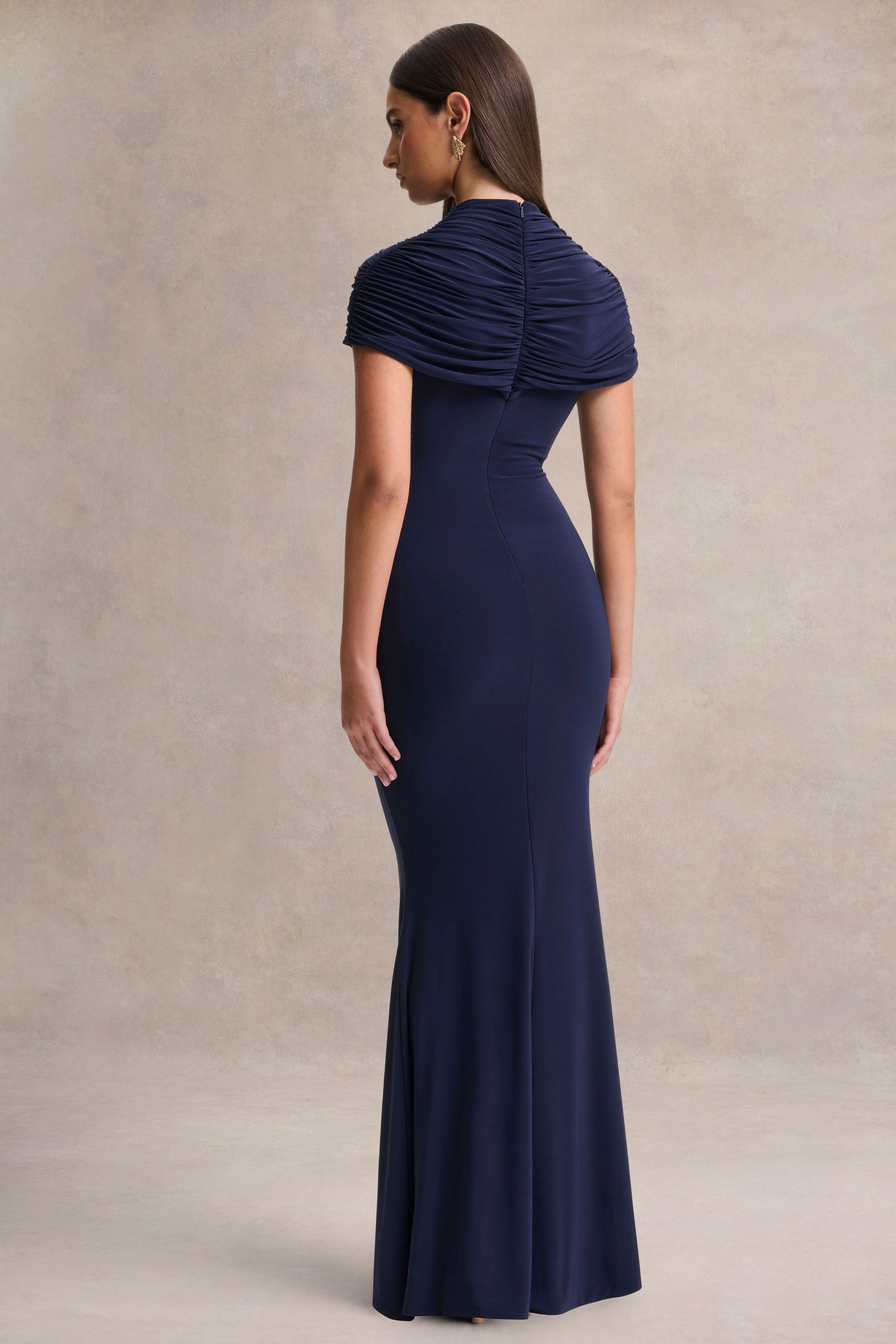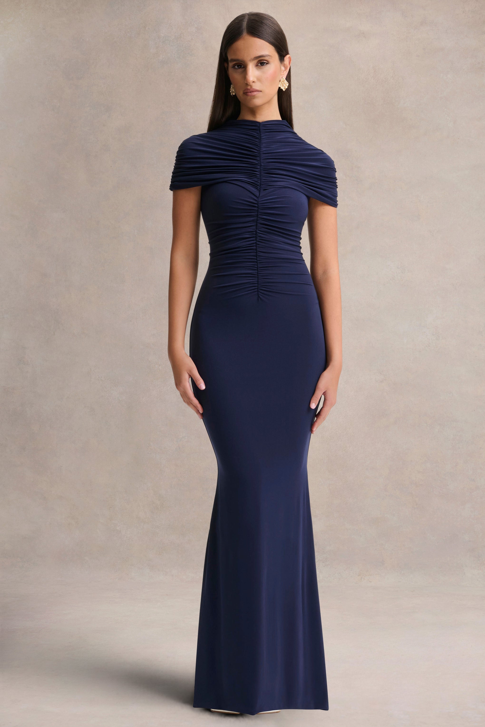 Azaria | Navy High-Neck Maxi Dress With Ruched Detailing