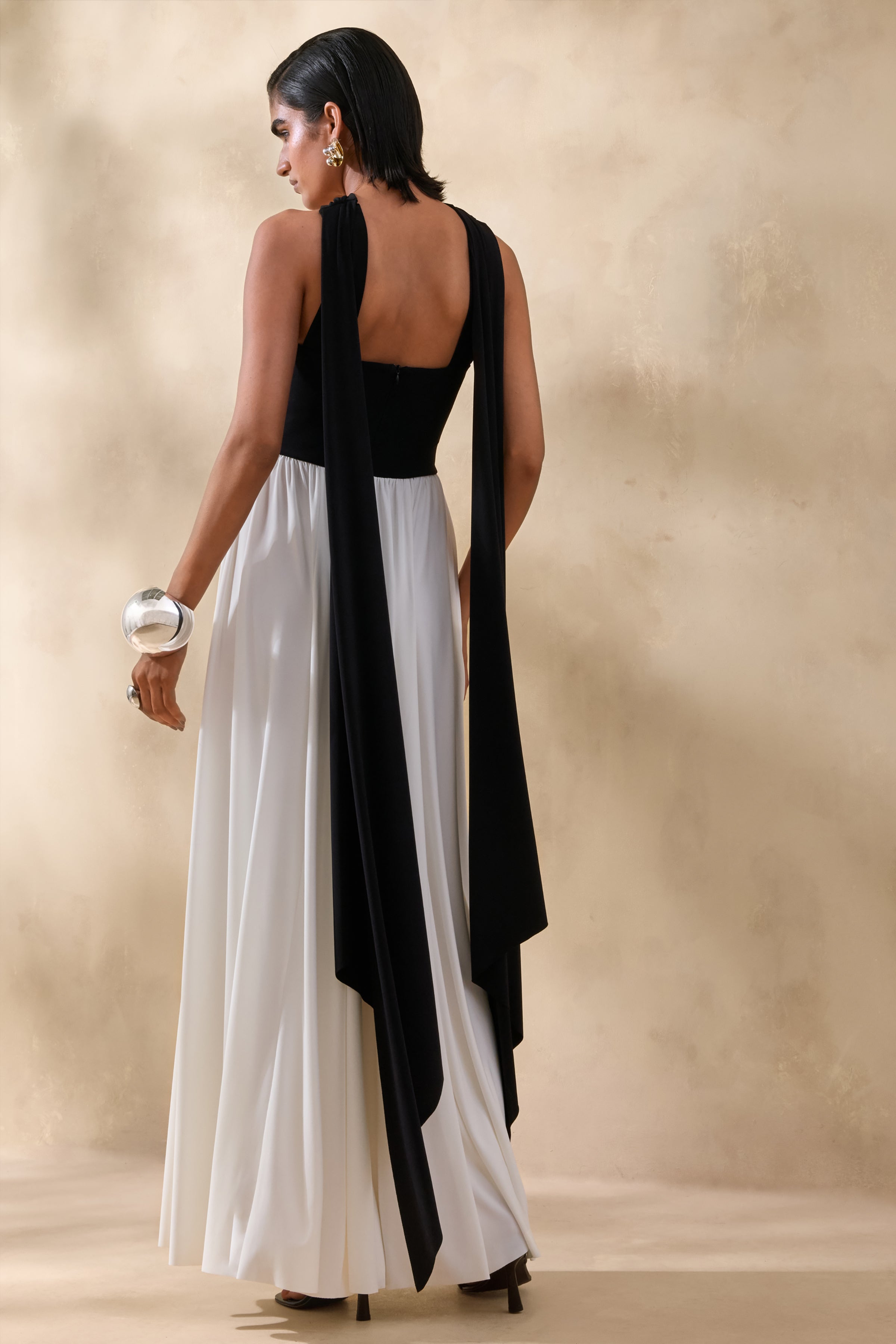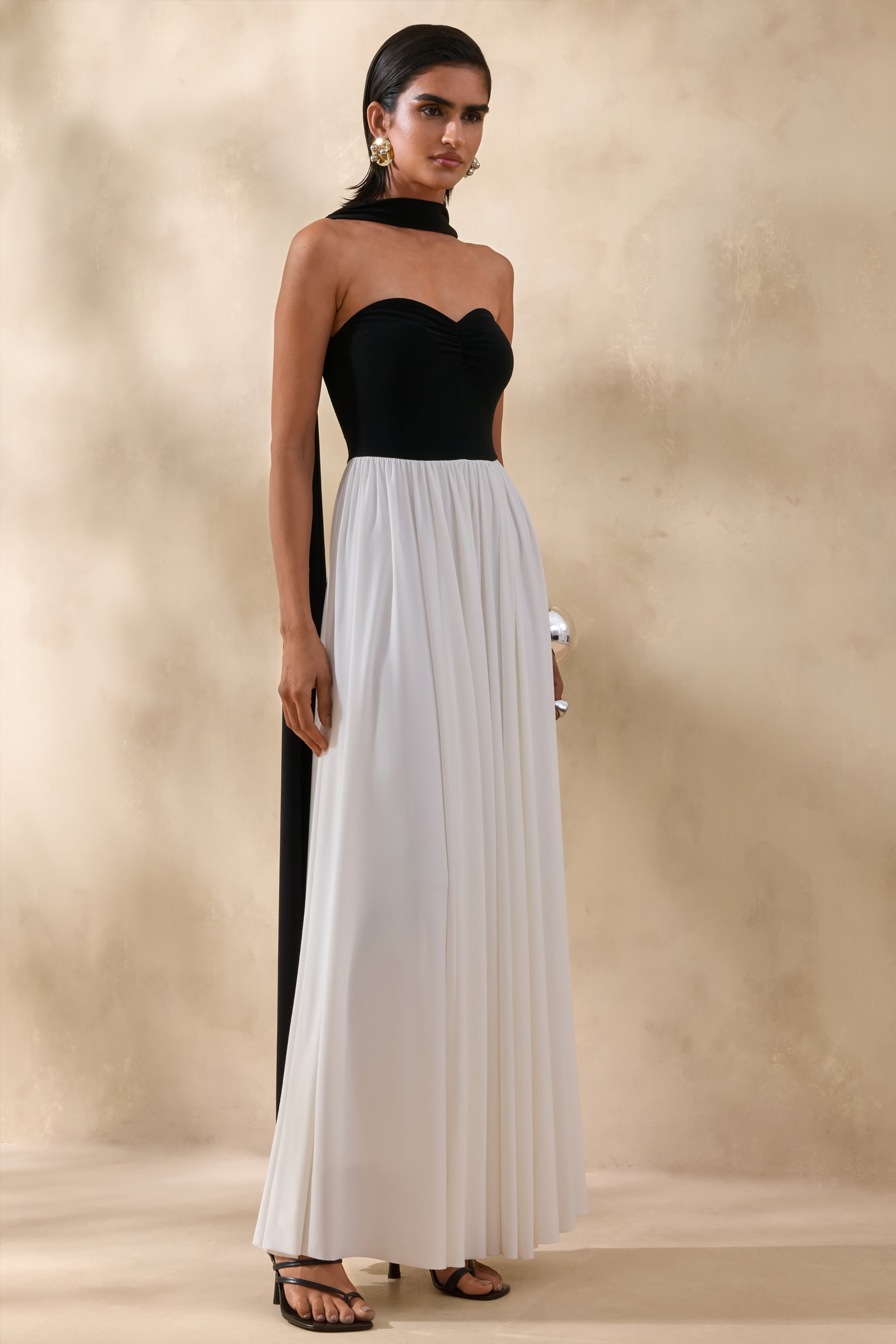 Beamora | Black & White Bandeau Maxi Dress With Cape