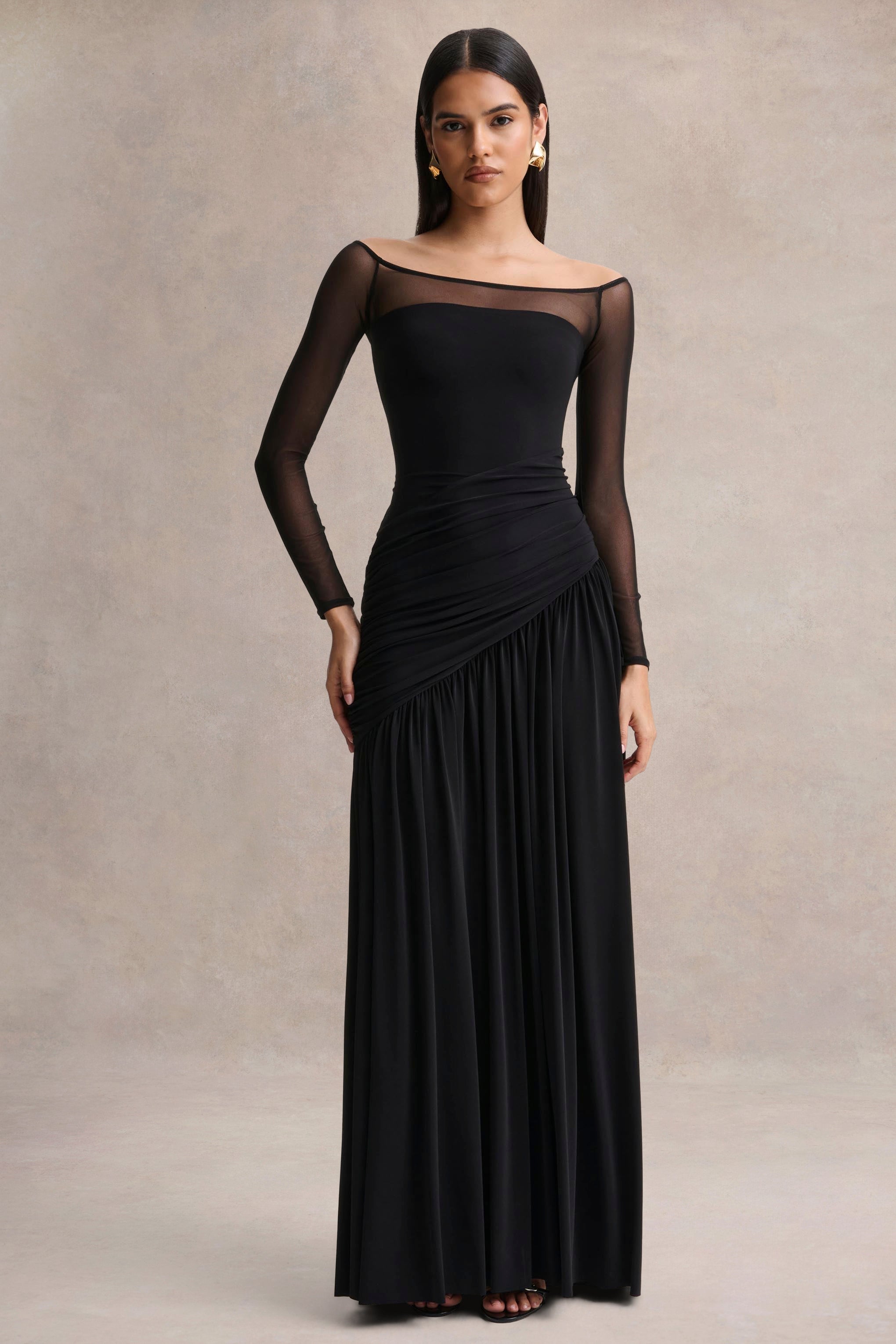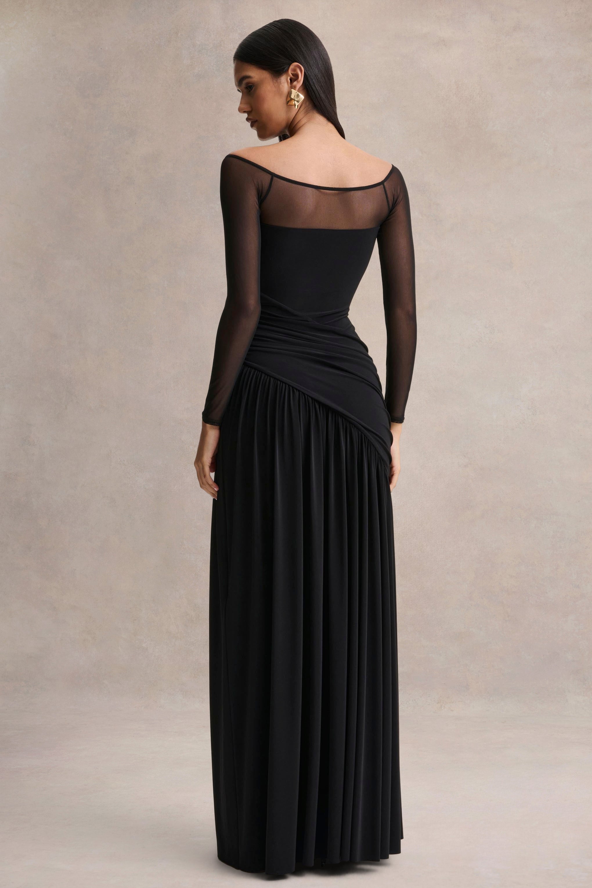 Bexley | Black Bardot-Neck Draped Maxi Dress With Long Mesh-Sleeves