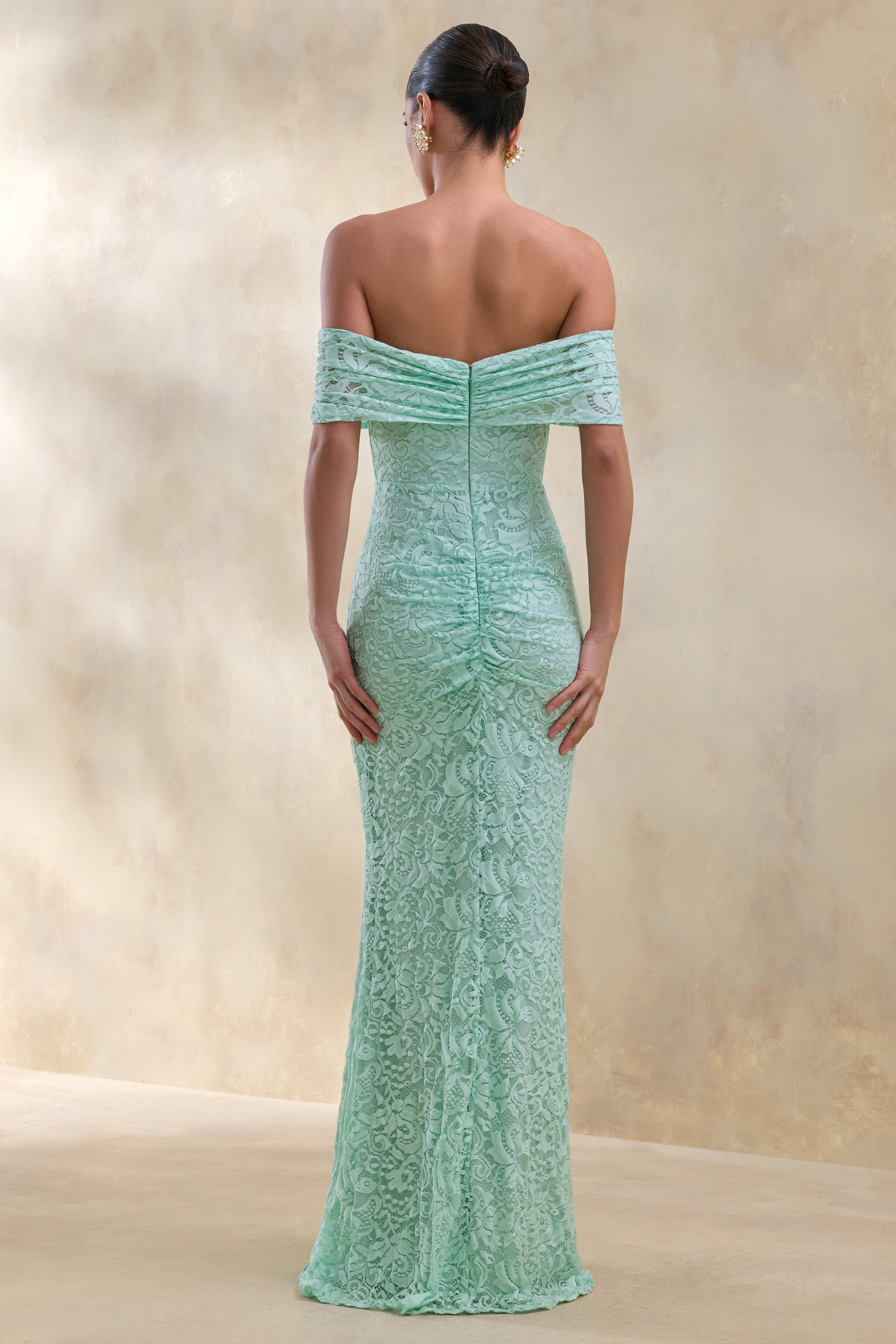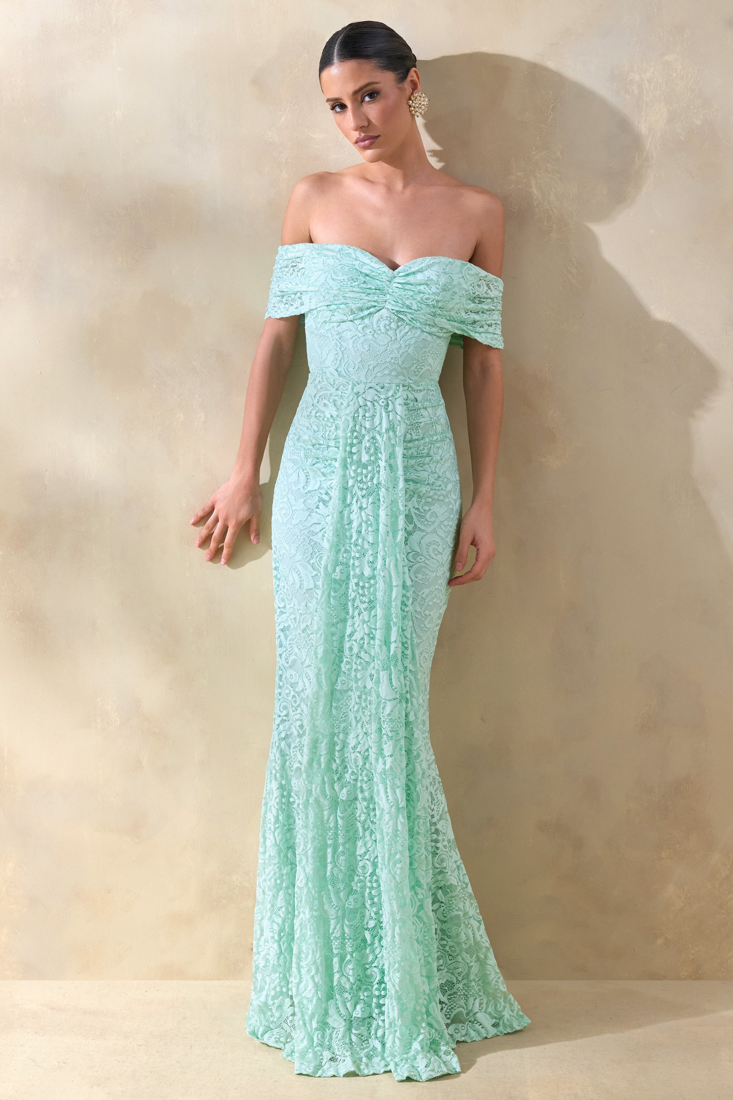 Aries | Mint Lace Bardot-Neck Maxi Dress With Gathered Detailing