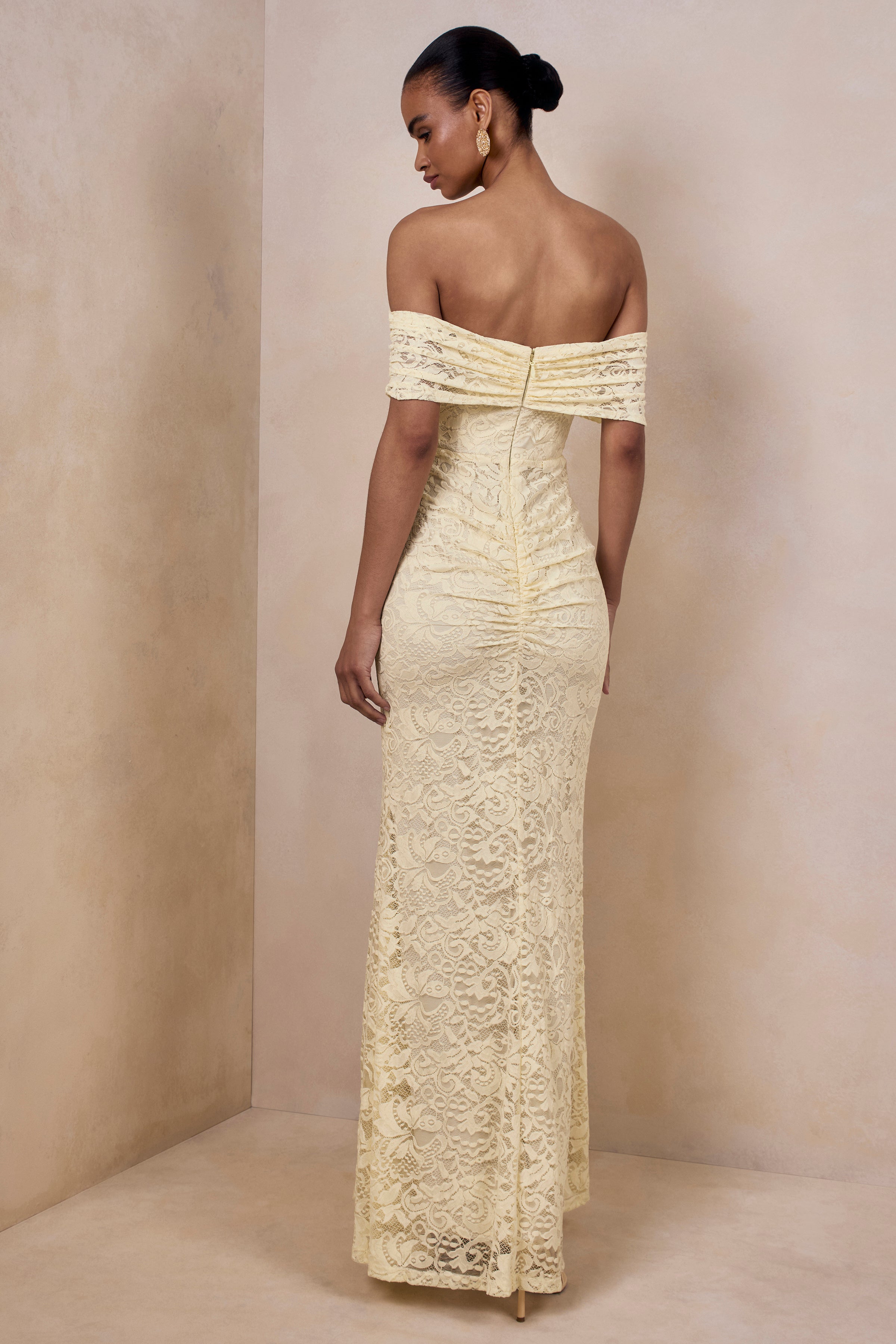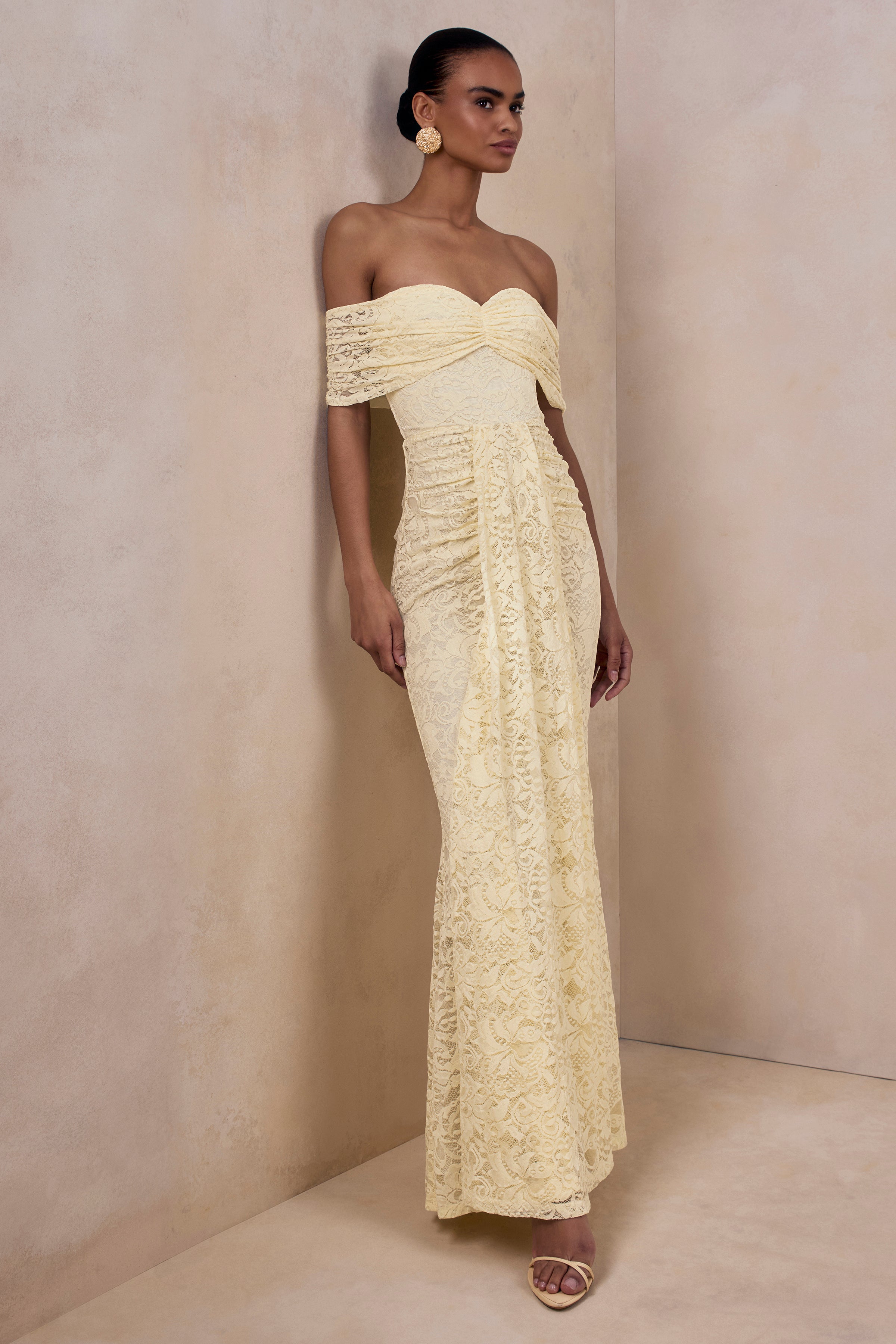 Aries | Lemon Lace Bardot-Neck Maxi Dress With Gathered Detailing