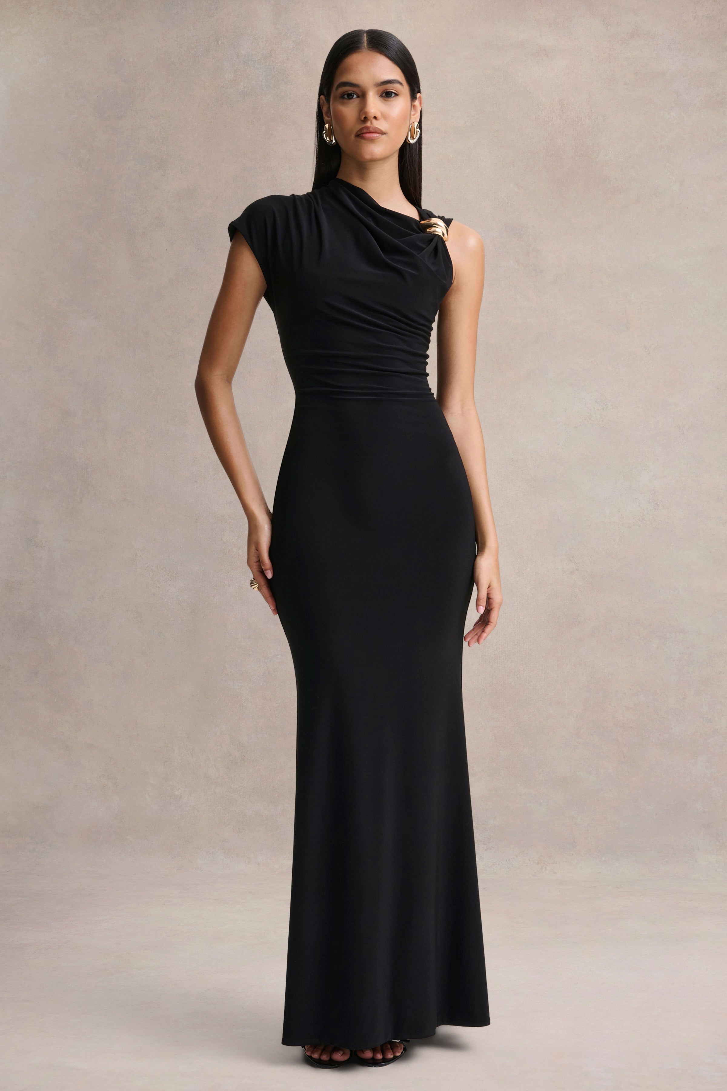 Blaire | Black Asymmetric-Neck Maxi Dress With Gold-Detailing