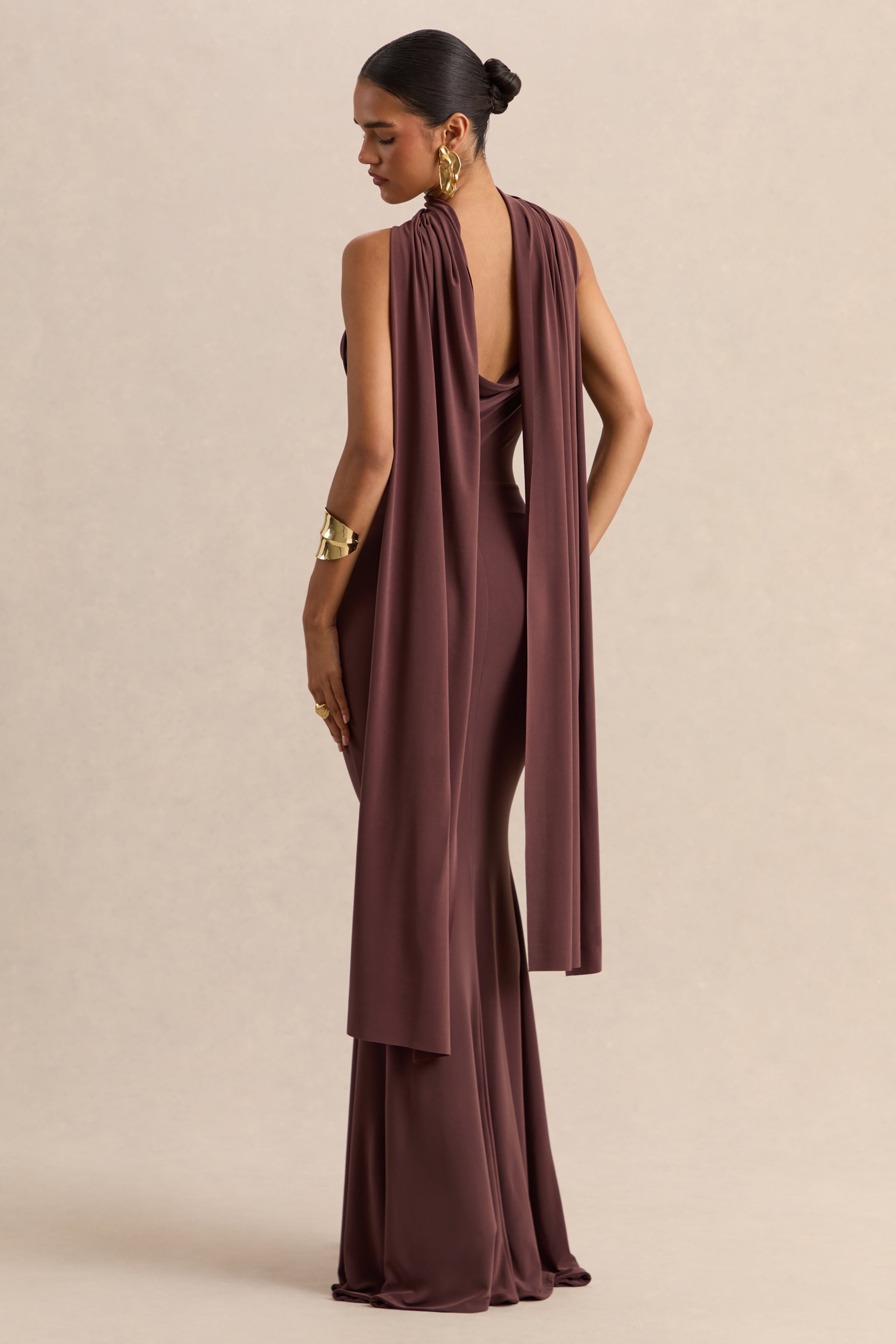 Armelia | Brown Cowl-Neck Maxi Dress With Scarf-Detail