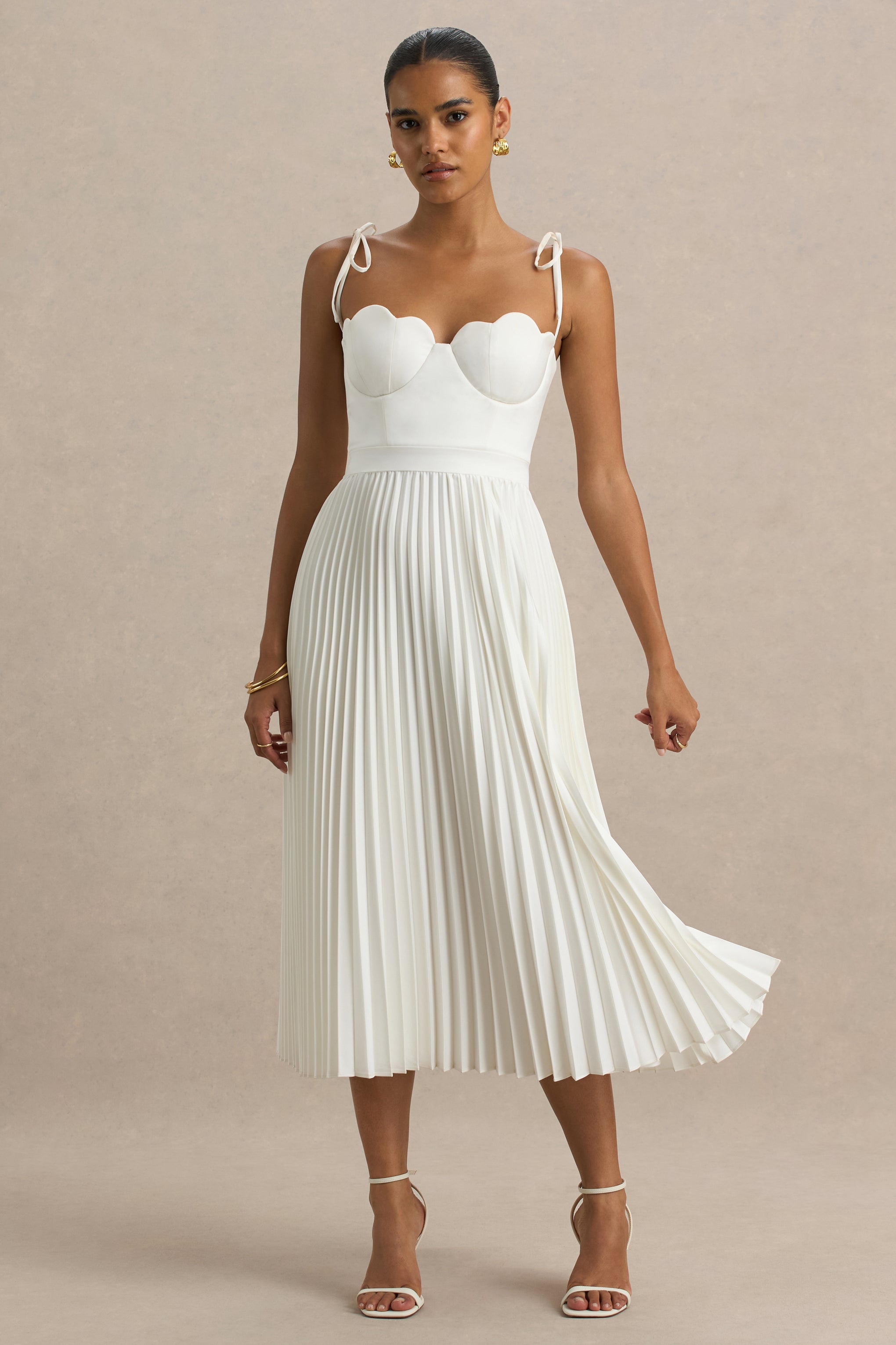 Look effortlessly chic this season in our Agua midi. Cut in a classic cream shade of our premium stretch satin. this timeless dress exudes elegance. Featuring a feminine neckline that frames your decolletage and is elevated with scallop-edged cups. for a modern twist. The pleated skirt adds movement with every gesture. making Agua the perfect option for events that call for dancing. Style with gold accessories for a look that'll capture the room's attention.