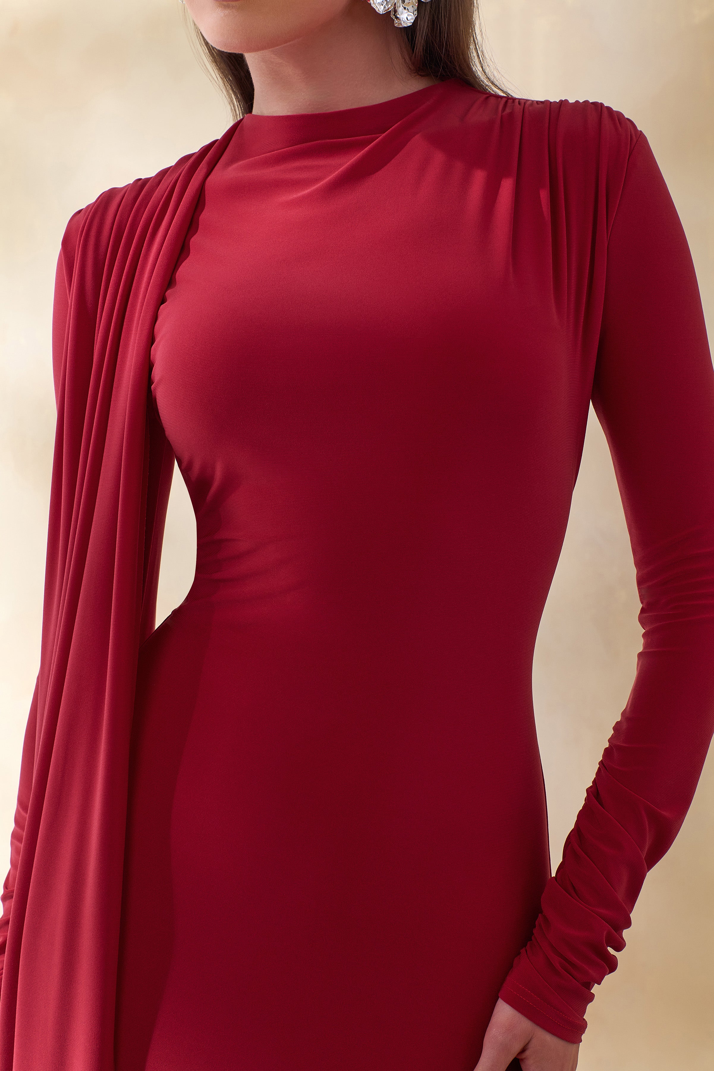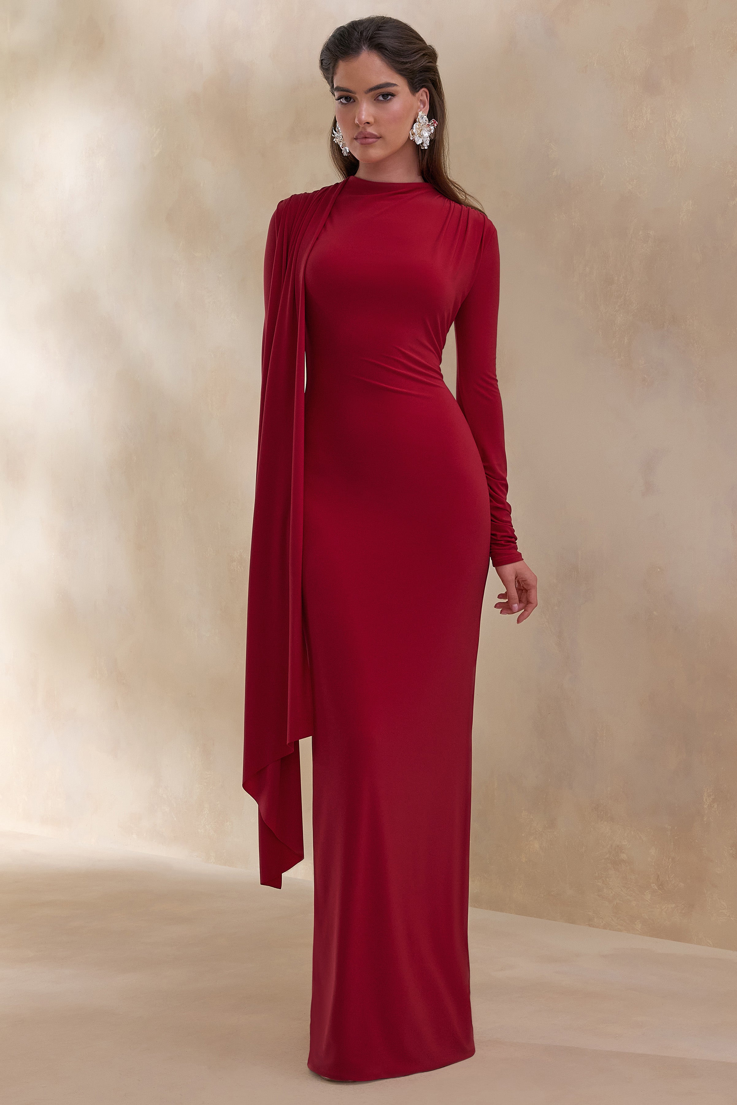 Amaria exudes understated sophistication through a silhouette that feels both sculpted and fluid. Crafted from our premium red stretch jersey. it contours the body with a smooth. figure-enhancing cut. The high neckline adds a sense of modern refinement. while the shoulder sash detail introduces soft movement and a subtle statement finish. A centre-back split ensures ease and allure in every step. flowing into a sleek maxi length. Amaria is designed for moments that call for quiet confidence and timeless elegance.