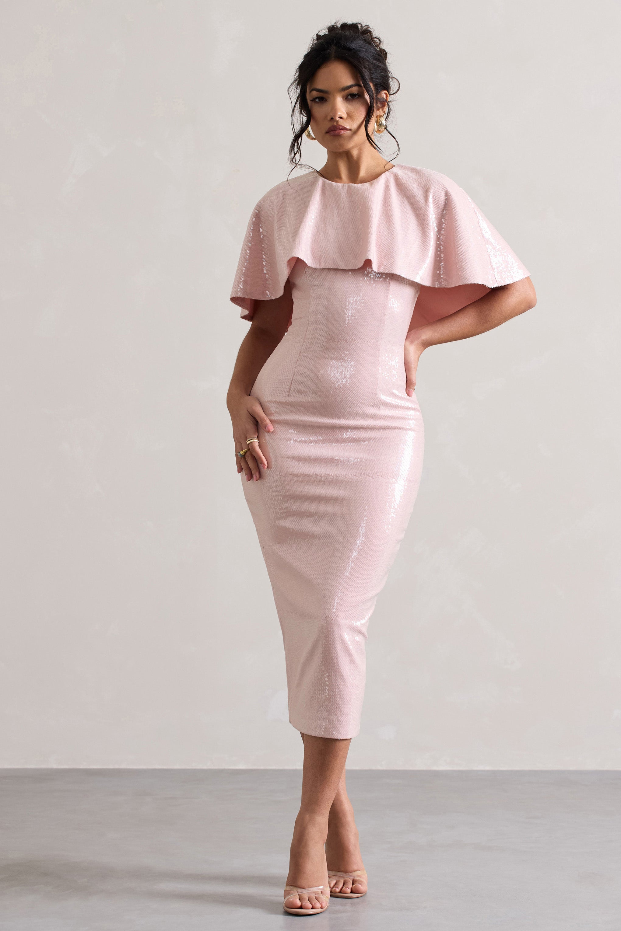 Simplistic yet glamorous this is Amelie. Our maxi dress has been cut in glistening pastel pink sequins. that catch the light as your move. Featuring a flattering figure skimming fit and elegant cape. pair this pretty in pink dress with our Catcher heels and a tousled bun. to turn heads at your next event.