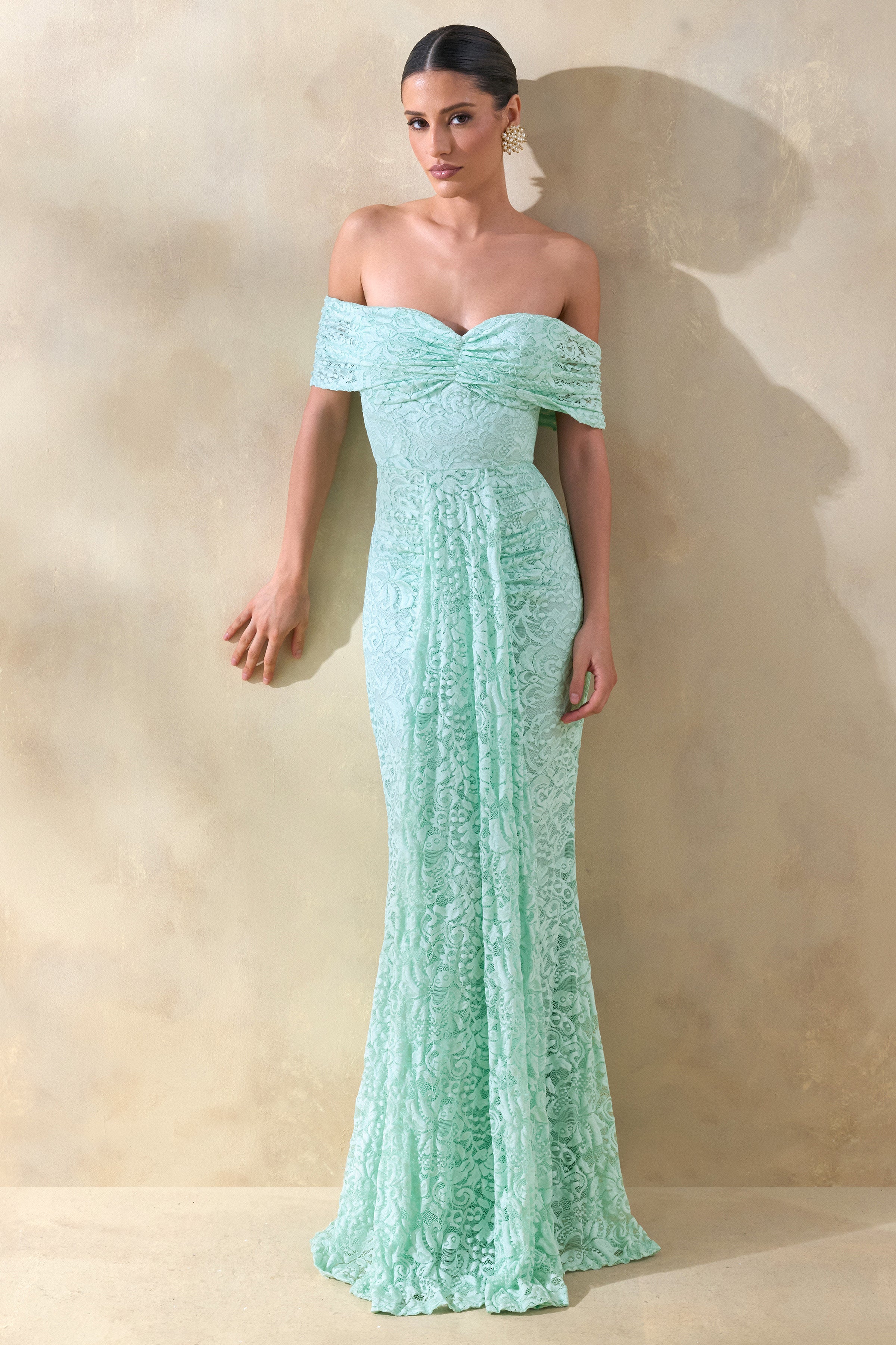 Aries captures soft radiance with a fresh. feminine silhouette. Crafted from our premium mint lace. this maxi dress embodies romantic elegance. The bardot neckline frames the shoulders. while gathered detailing adds refined dimension. A sash accent enhances the waist with gentle movement. completing the look with effortless charm. Aries is made for moments that call for captivating style.