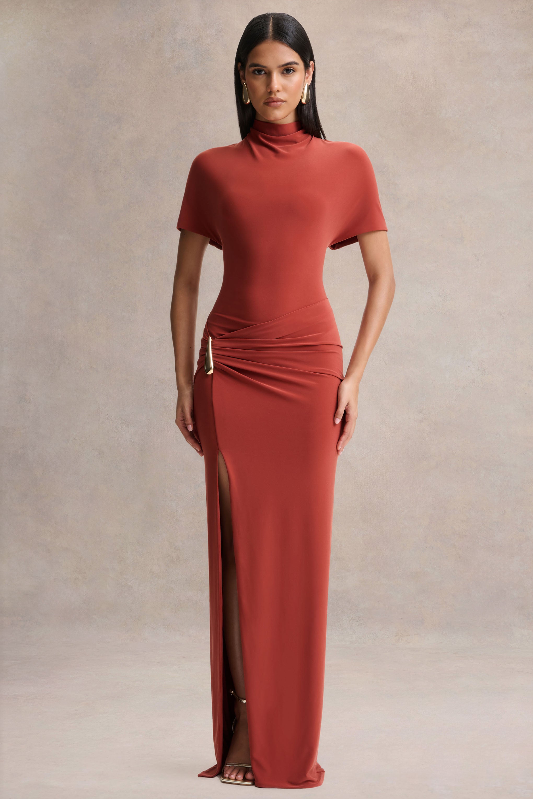 Fierce. refined. and unforgettable. Arlena is your ultimate statement-maker. Designed in our premium red stretch jersey. this maxi dress sculpts the body with effortless ease while offering comfort and movement. The high neckline and gathered wrap detail create a sophisticated silhouette. accented by a touch of gold hardware at the waist for a chic finish. A daring front-high split adds drama. balancing elegance with allure. Arlena is a show-stopping piece made for evenings that demand confidence and glamour.