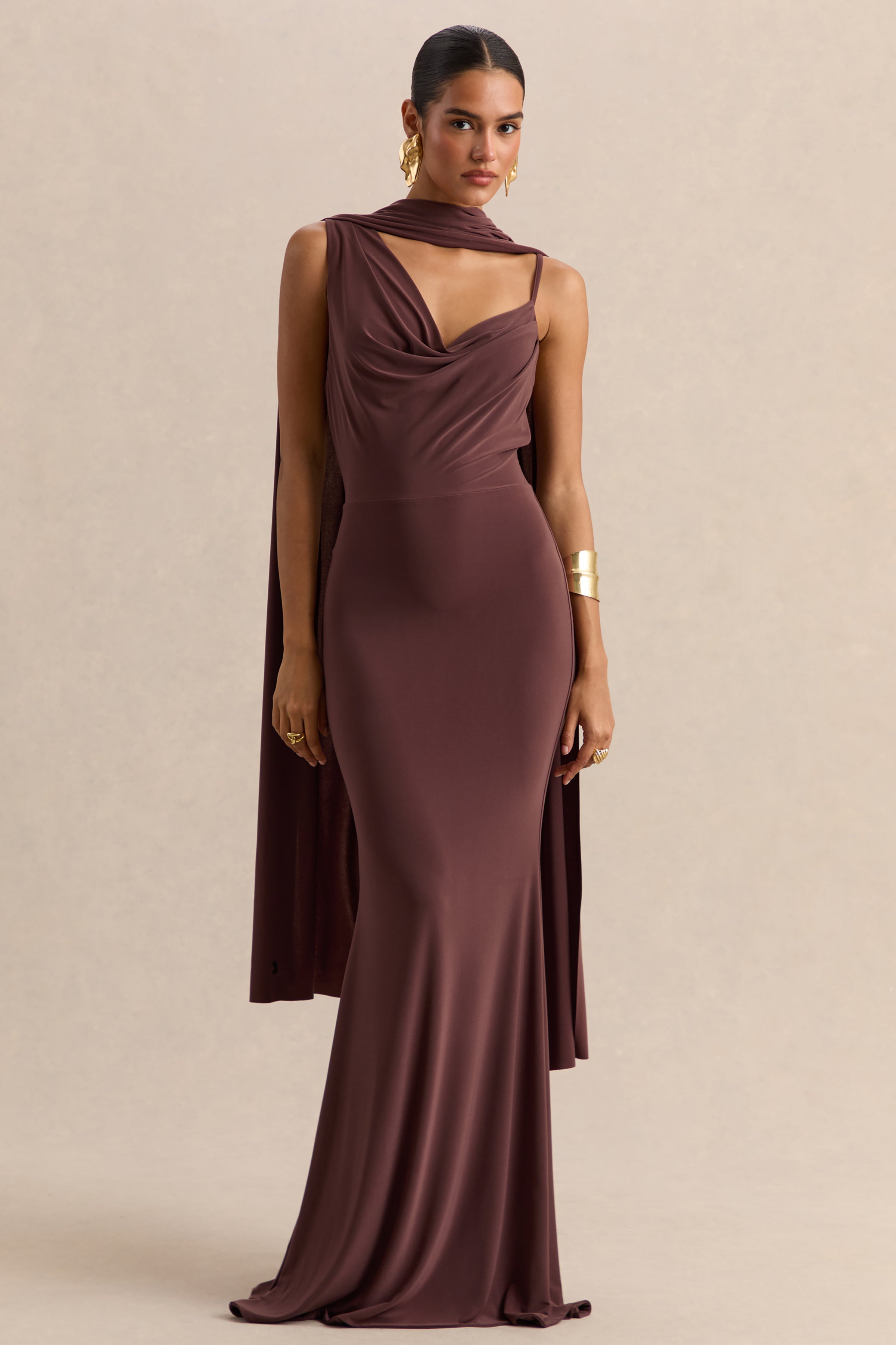 Command attention in Armelia. our elegant maxi that was designed to leave an impression. Crafted from our premium stretch jersey in a rich brown hue. this dress smooths and contours the body with a flattering fit. The cowl neckline highlights the decolletage with a romantic charm. while scarf detail adds elegance and sophistication. For your next special occasion choose Armelia and turn everyone's heads.