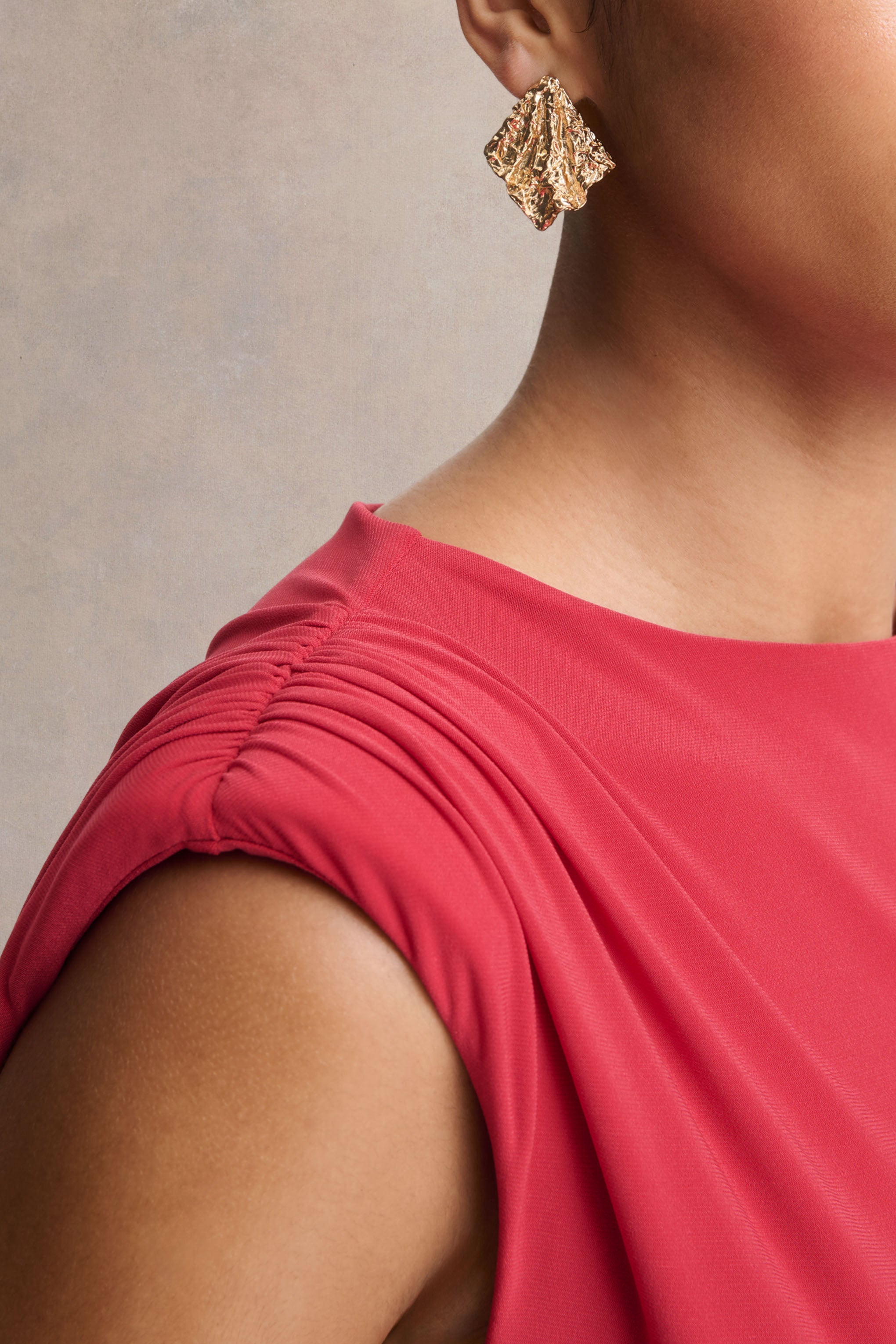 Aubrey is the perfect fusion of sophistication and allure. Crafted from our premium stretch jersey in a bold red hue. this mini-length design sculpts the silhouette with sleek precision. The high neckline brings a touch of refinement. while the wrap and sash detailing create soft movement and a cinched. flattering shape. Finished with an invisible zip closure for a seamless fit. Aubrey is made for statement moments that call for confidence and contemporary glamour.