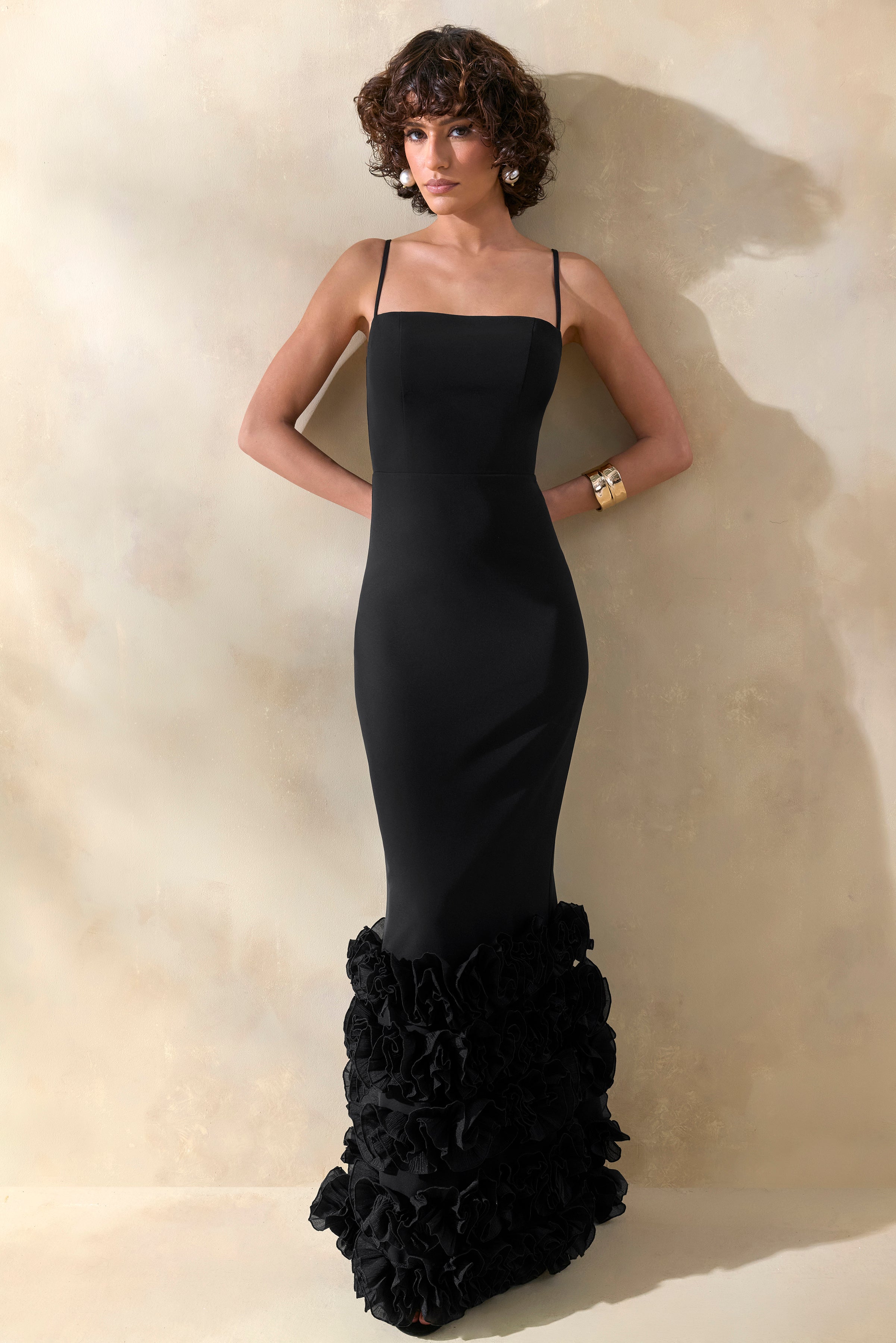 Turn heads in Aurose. a dress that combines sleek sophistication and effortless glamour. Crafted from our premium black crepe. this maxi dress is designed to flatter your silhouette from every angle. This style features an elegant square neckline. and ruffled fishtail hemline that brings a touch of drama and glamour. Aurose is an unforgettable statement piece. perfect for evening where elegance meets allure.