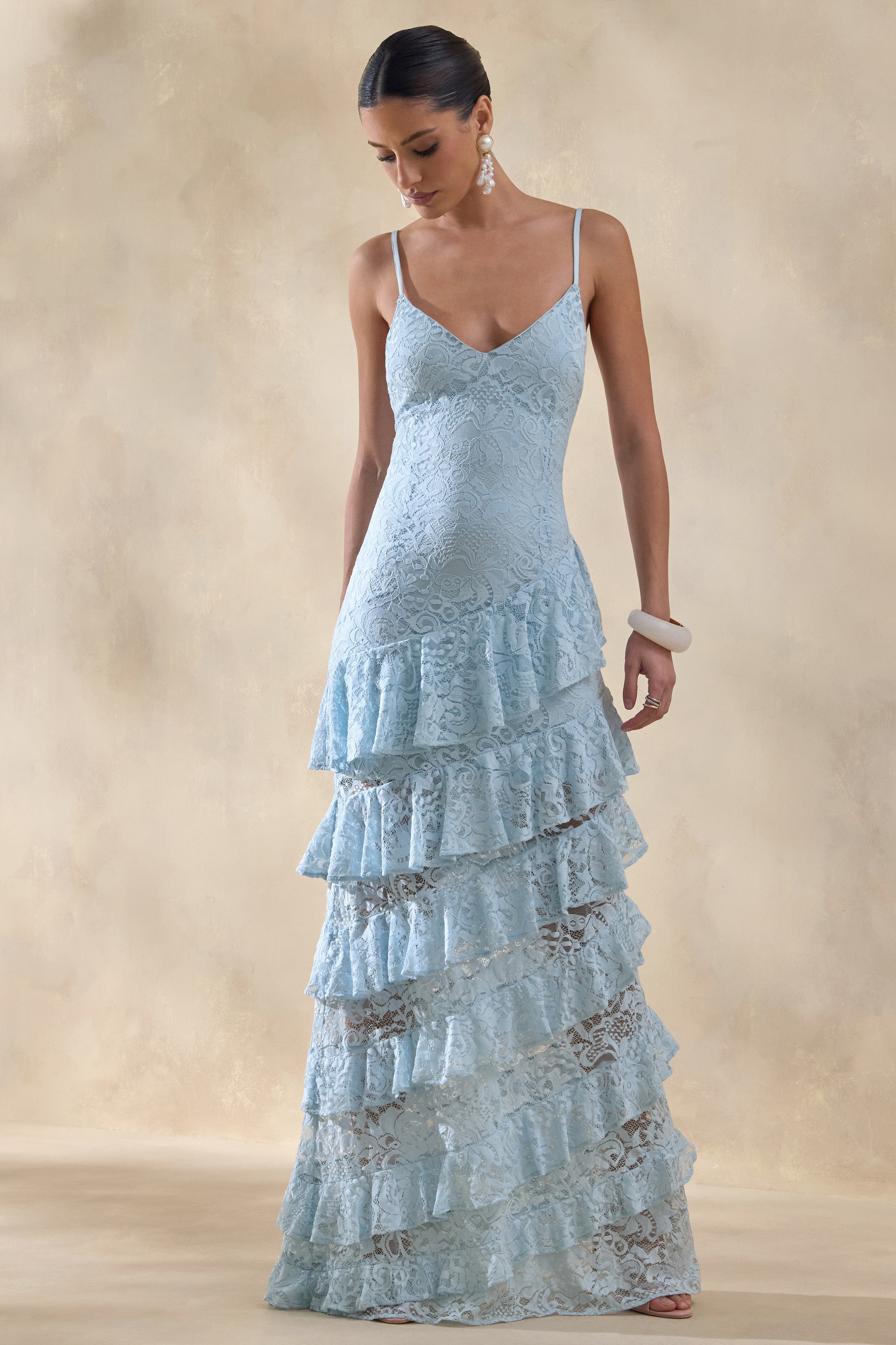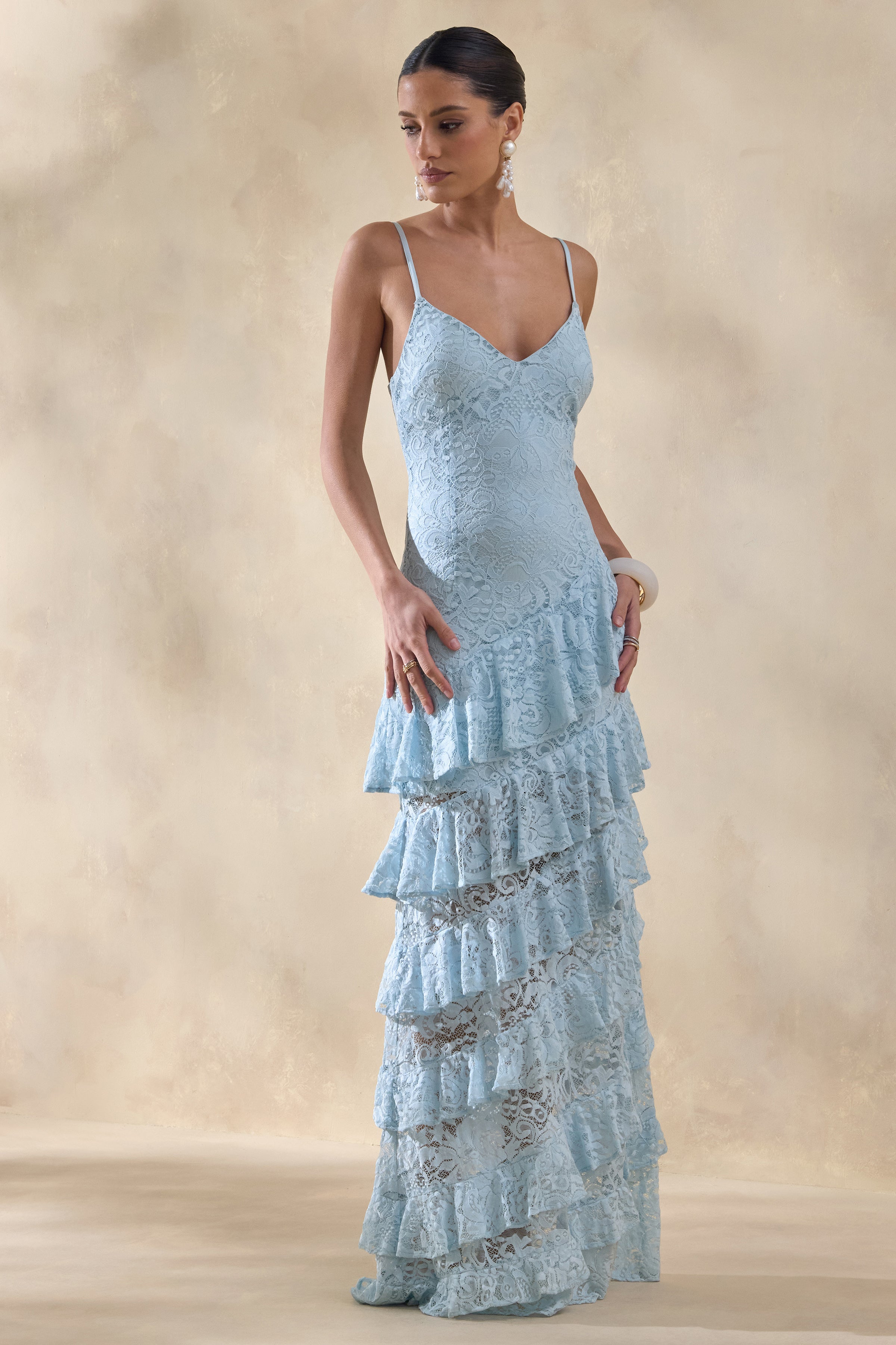 Avelisse radiates romantic elegance with a silhouette designed to move beautifully with every step. Crafted from our premium blue lace. this maxi brings softness and texture in equal measure. The plunge neckline creates a striking focal point. while the tiered ruffled skirt adds soft volume and graceful movement. Delicate yet impactful. Avelisse is made for moments that call for effortless charm and elevated femininity.