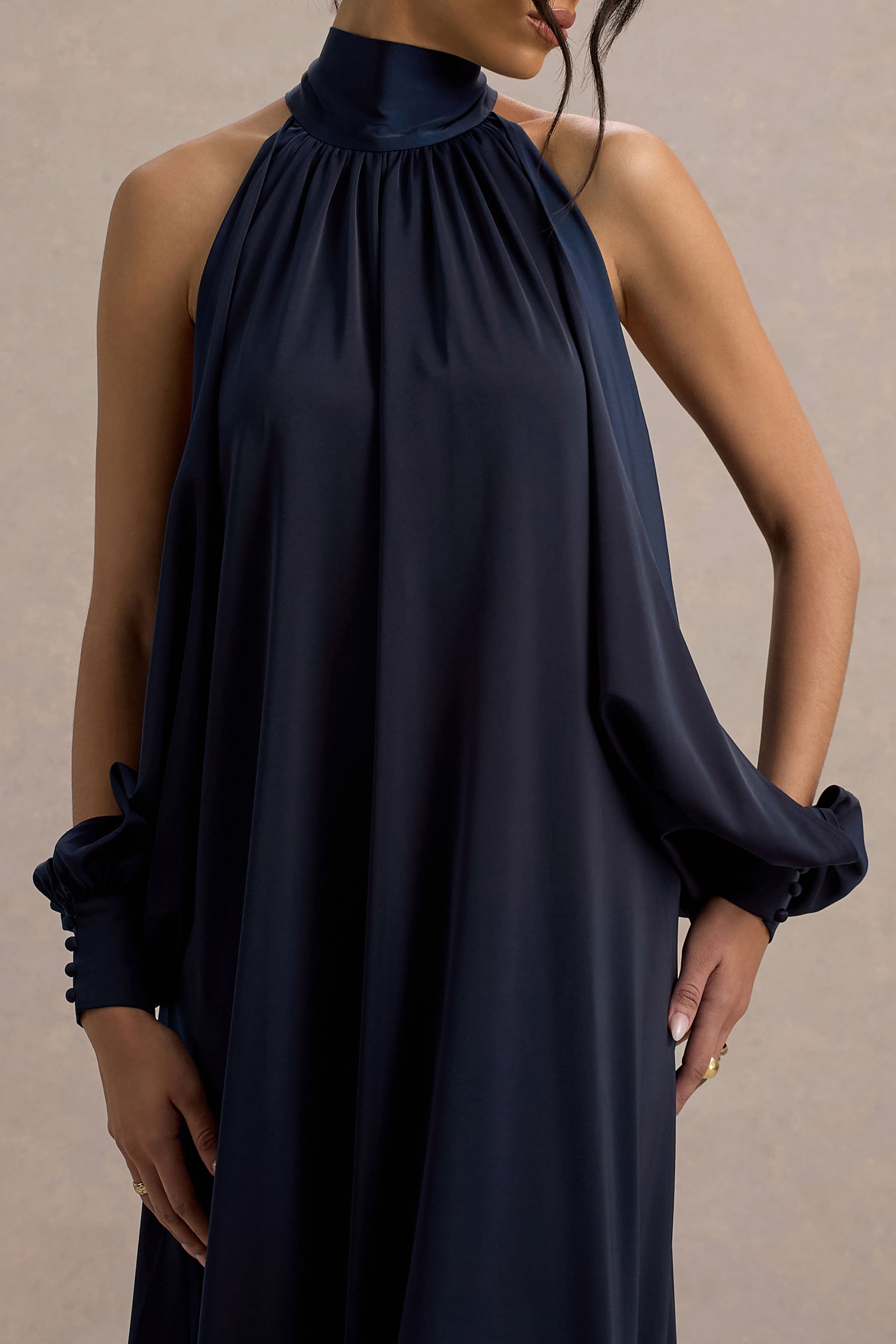 Baila is an elegant and striking choice for your next special occasion. Crafted from premium navy satin. this high-neck maxi dress exudes luxury with its fluid silhouette and rich sheen. The standout cape sleeves add a dramatic. ethereal touch. while the sleek fit beautifully skims your figure. Style Baila with strappy heels and minimal accessories to let this statement dress take centre stage at your next event.