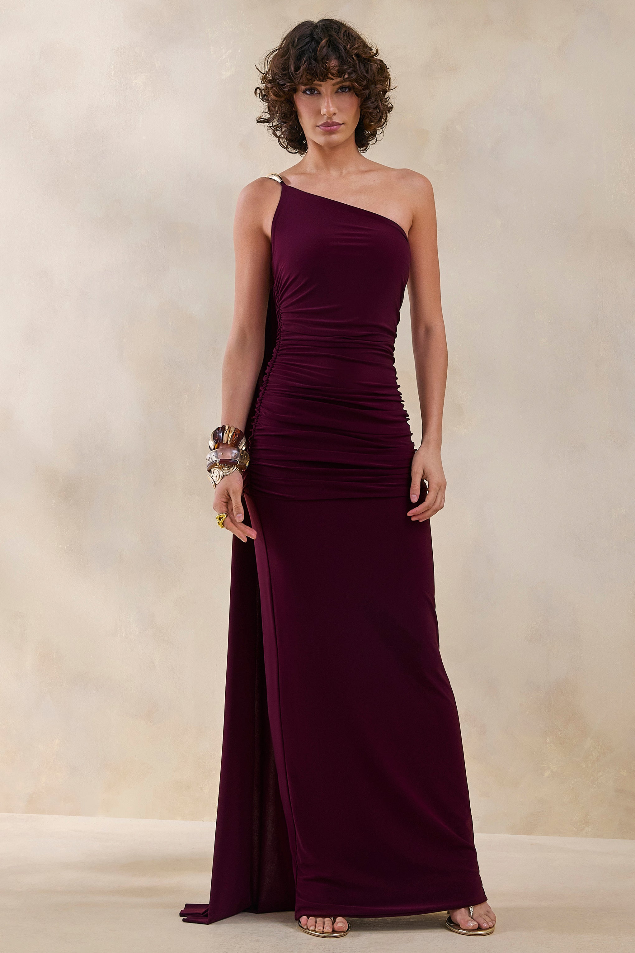 Betine showcases statement sophistication through a striking. sculpted silhouette. Crafted from our burgundy premium stretch jersey. this design drapes beautifully across the body while offering a smooth. sleek fit. The asymmetric neckline is elevated by a gold shoulder detail. paired with a flowing cape sleeve that commands attention with every step. Elegant. modern. and effortlessly impactful. Betine is made for moments that deserve a dramatic entrance.