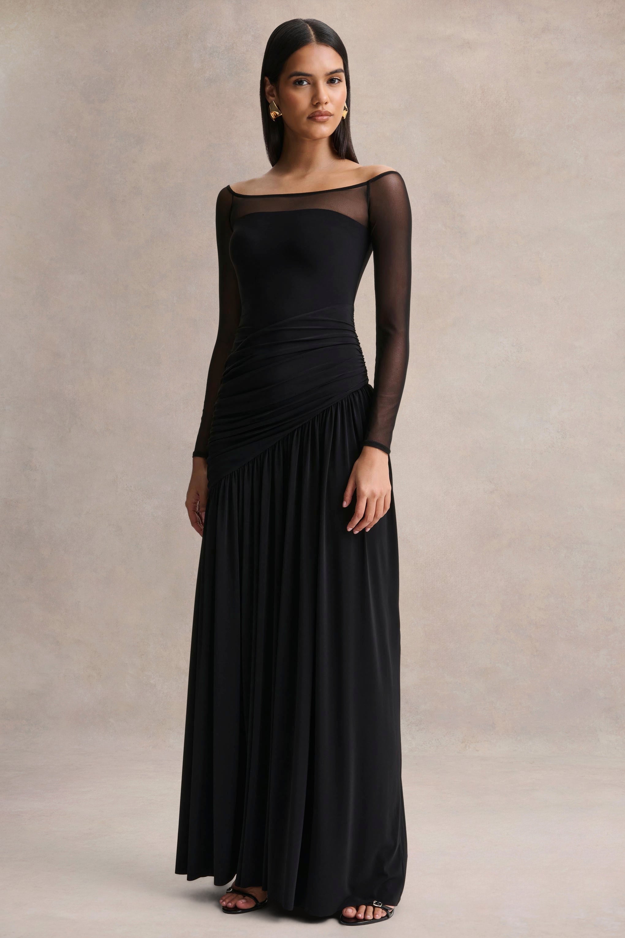 Bexley is the ultimate blend of sophistication and allure. Crafted from our premium stretch jersey in a rich black hue. this maxi-length design sculpts the silhouette with effortless elegance. The bardot neckline exudes timeless femininity. complemented by sheer long mesh sleeves for a touch of modern refinement. Finished with gathered detailing that enhances every curve. Bexley is designed for evenings that call for understated glamour.