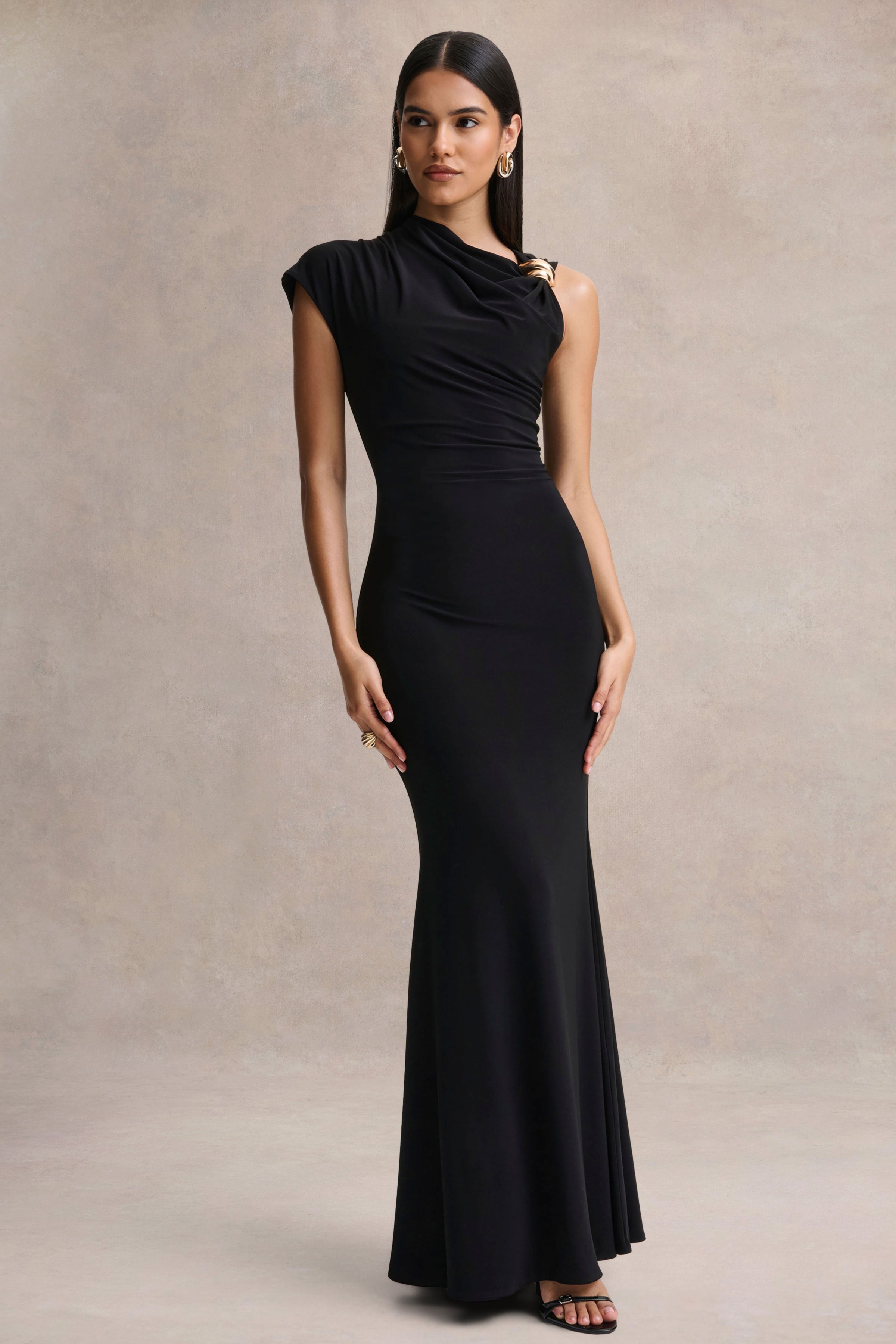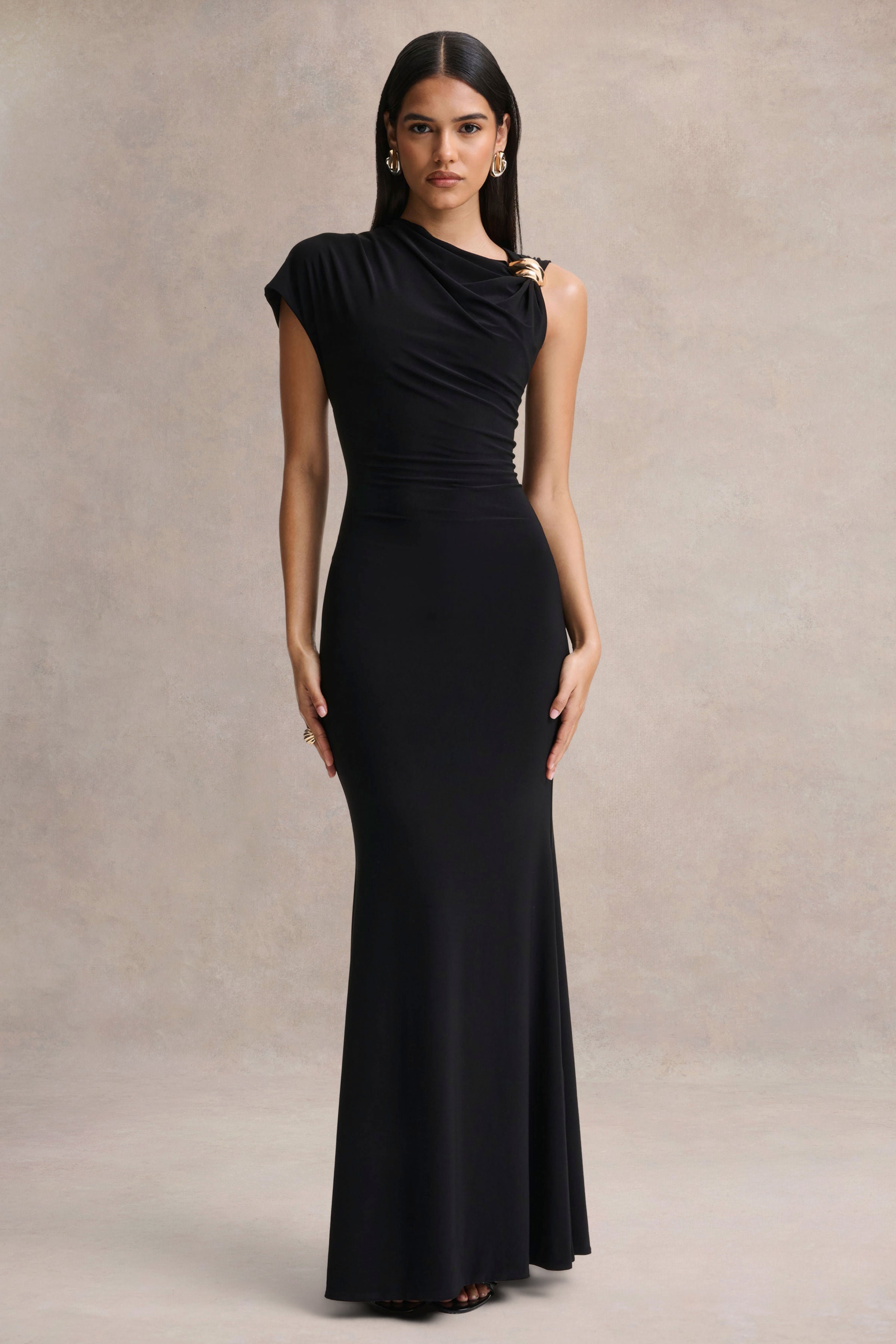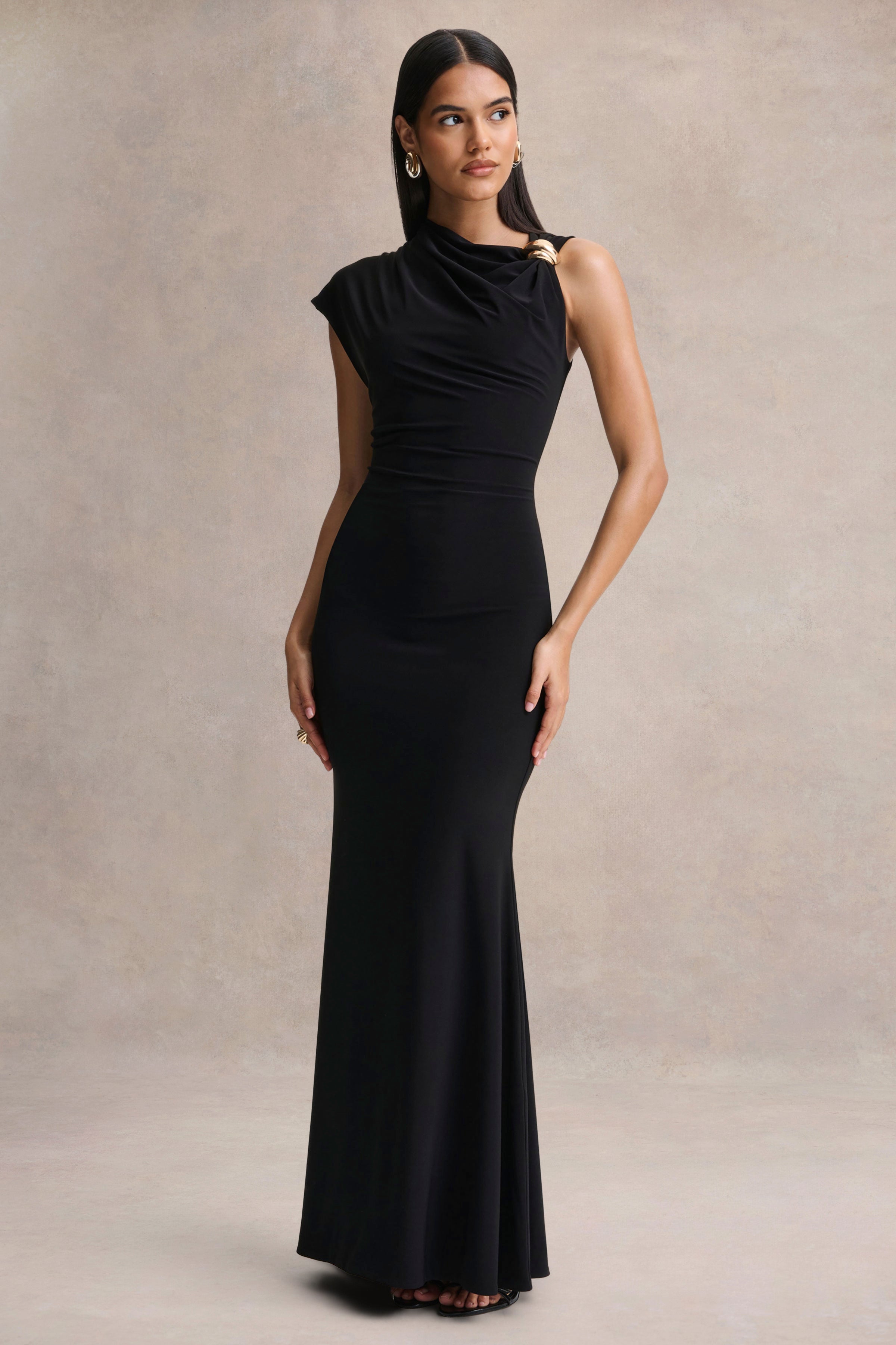 Blaire embodies sophistication with a refined silhouette. Crafted from our premium stretch jersey in a black hue. this maxi design contours the figure with smooth. effortless precision. The asymmetric neckline creates a striking focal point. enhanced by a touch of gold detailing that adds subtle luxury. Minimal yet undeniably captivating. Blaire is made for moments that call for polished elegance and understated allure.