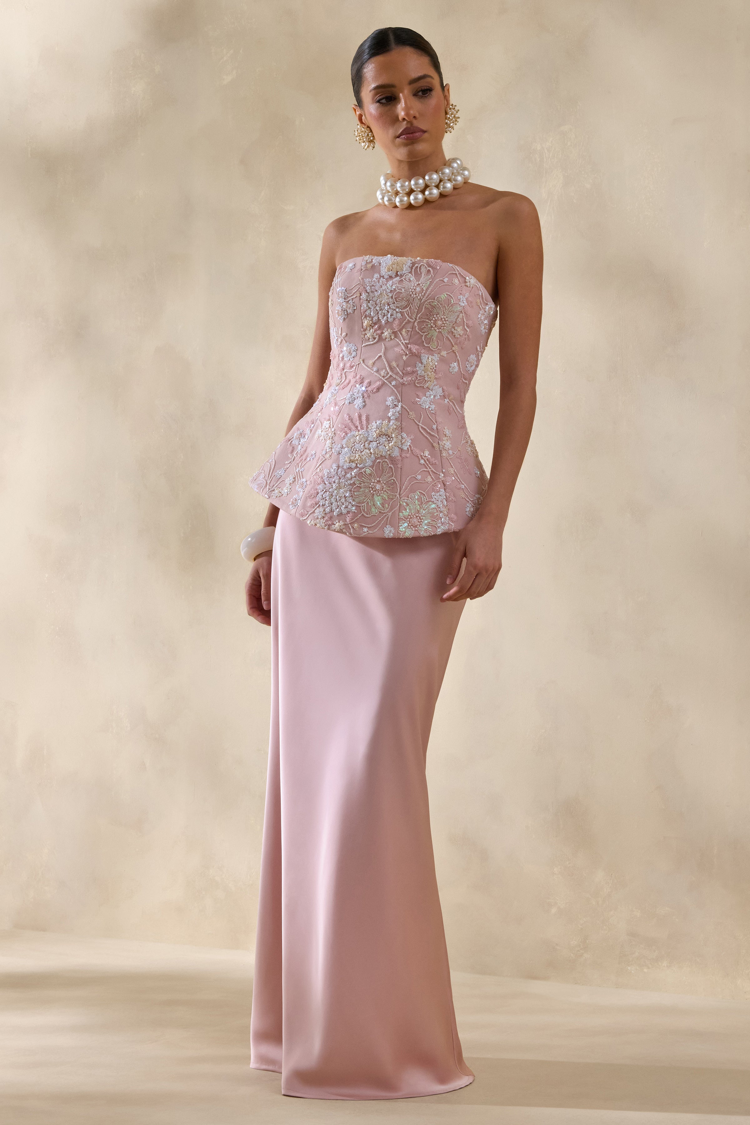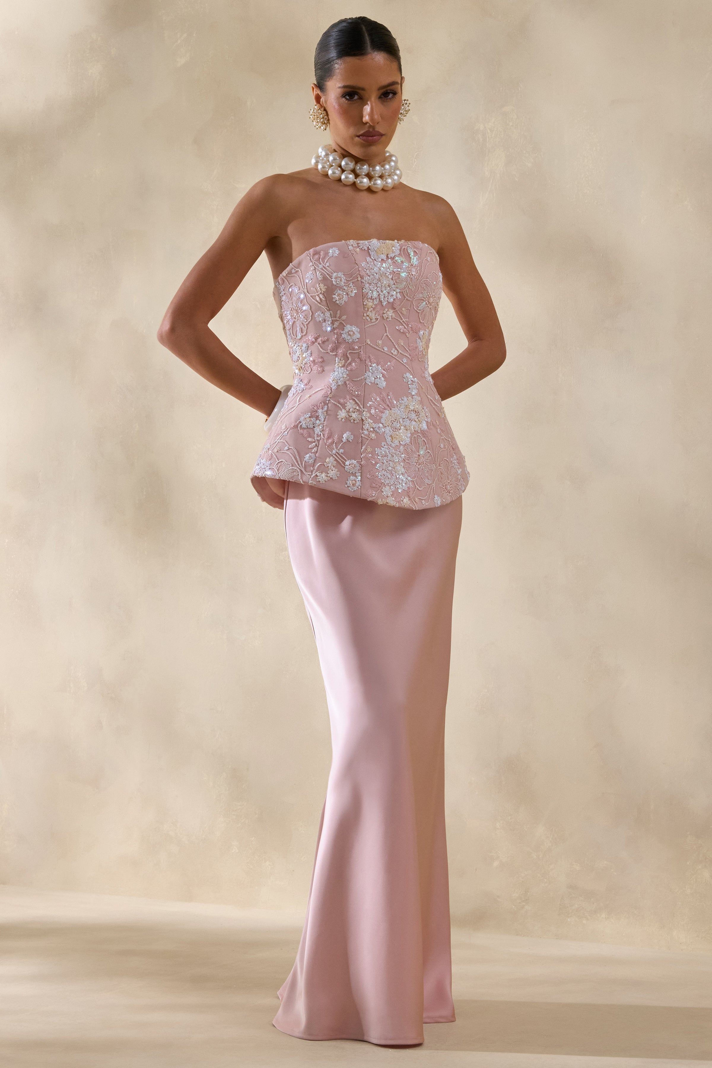 Corvina | Pink Embellished Floral Bandeau Corset Maxi Dress