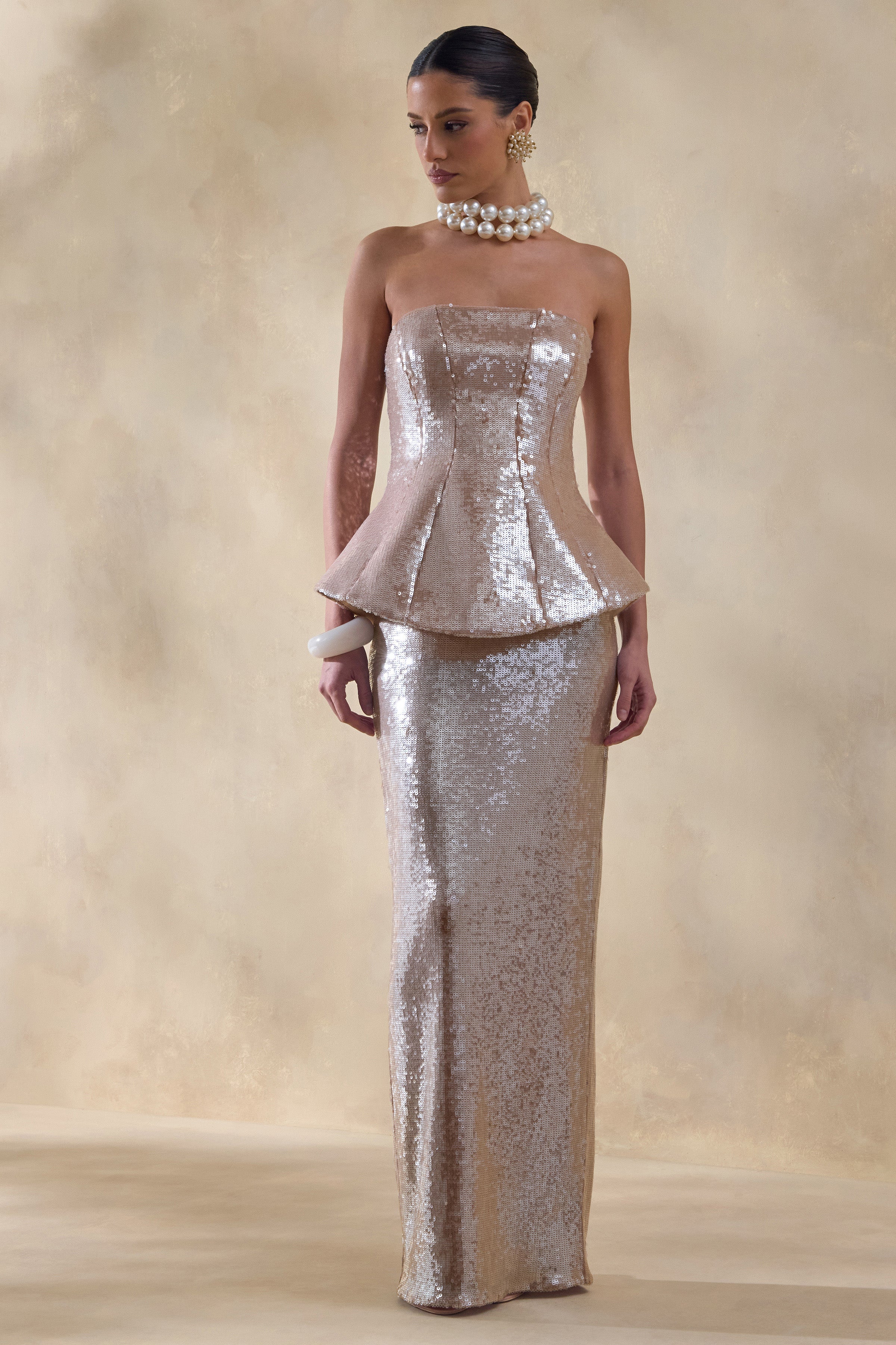 Dalisse radiates timeless glamour with a modern. feminine edge. Crafted from our premium nude sequins. this maxi dress features a bandeau neckline and a structured corseted bodice that flatters the silhouette. while the centre-back split adds a touch of effortless drama. Sparkling and sophisticated. in Dalisse you will stand out from the crowd.
