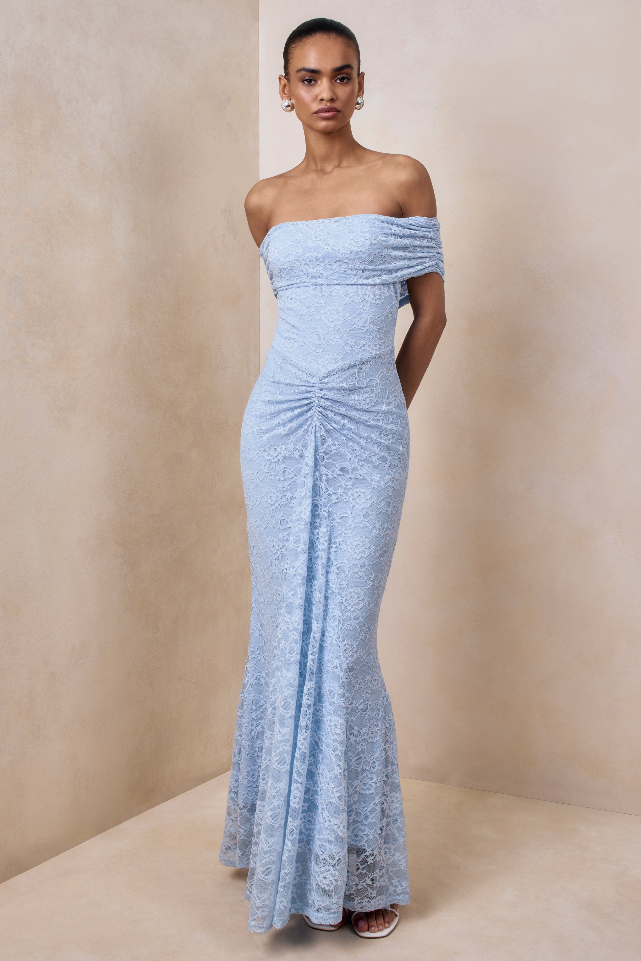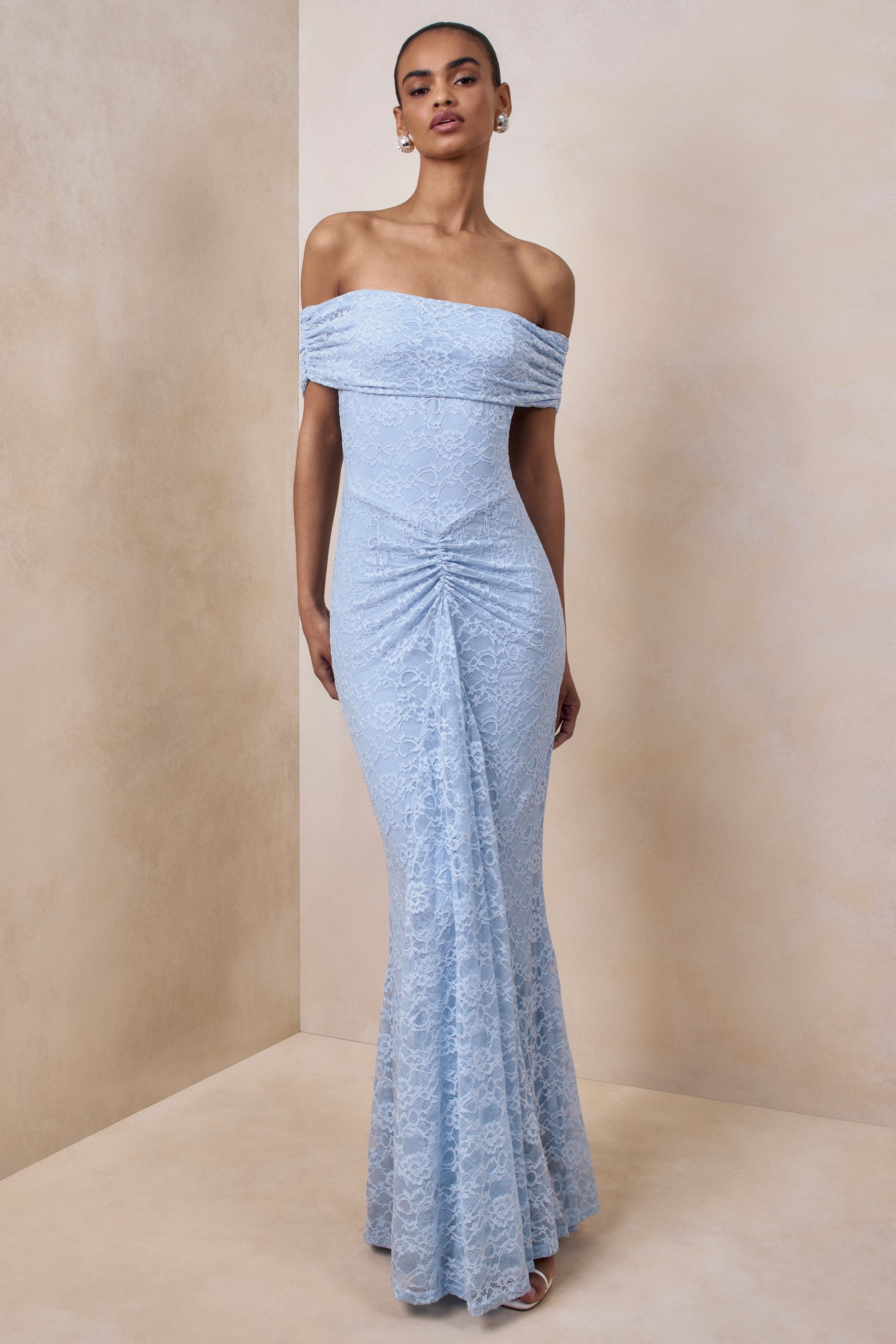 Elinor embodies understated romance with a graceful. feminine allure. Crafted from our premium powder blue lace in a flowing maxi length. this design creates an effortlessly elegant statement. Featuring a bardot neckline that highlights the decolletage. and soft gathered detailing to enhance your figure. Elinor is designed for moments that call for timeless style and refined sophistication.