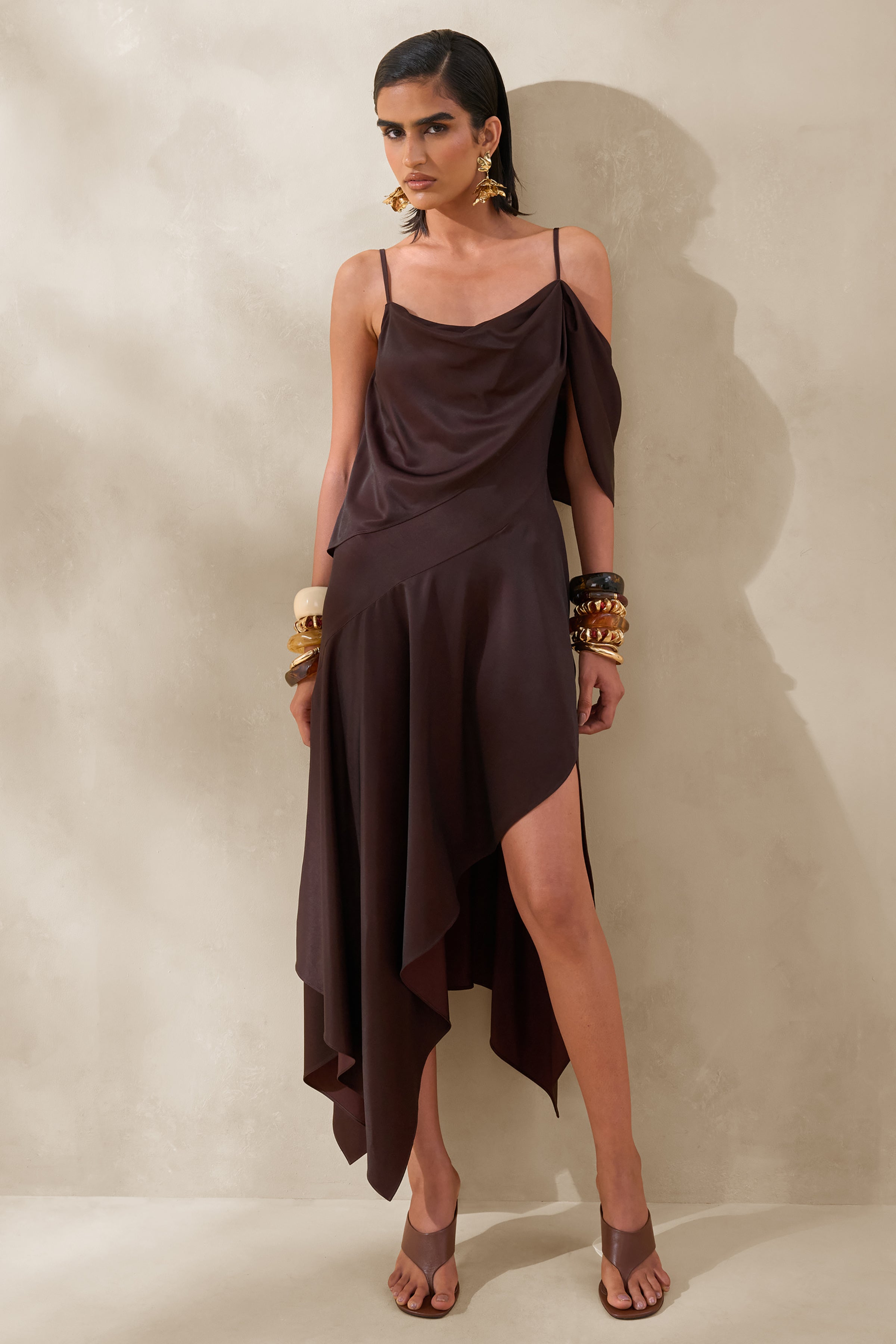 Say hello to Helira. a statement of modern elegance and allure. Crafted in our premium satin in rich brown shade. this midi dress is the perfect balance of elegance and drama. The asymmetric silhouette makes the design playful and modern. while draped detailing brings romantic charm. Modern. and effortlessly chic. in Helira you will make a statement at any occasion.