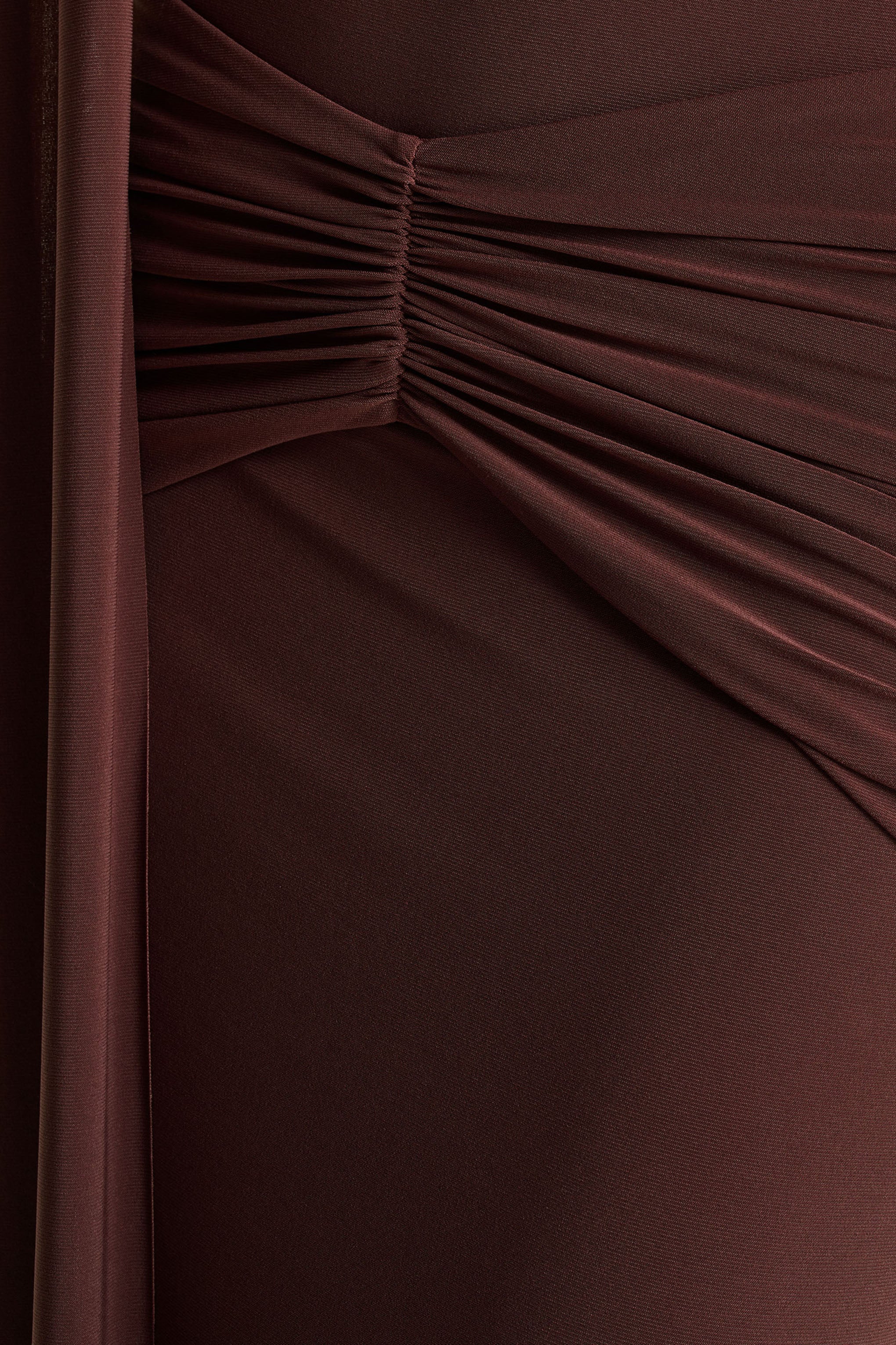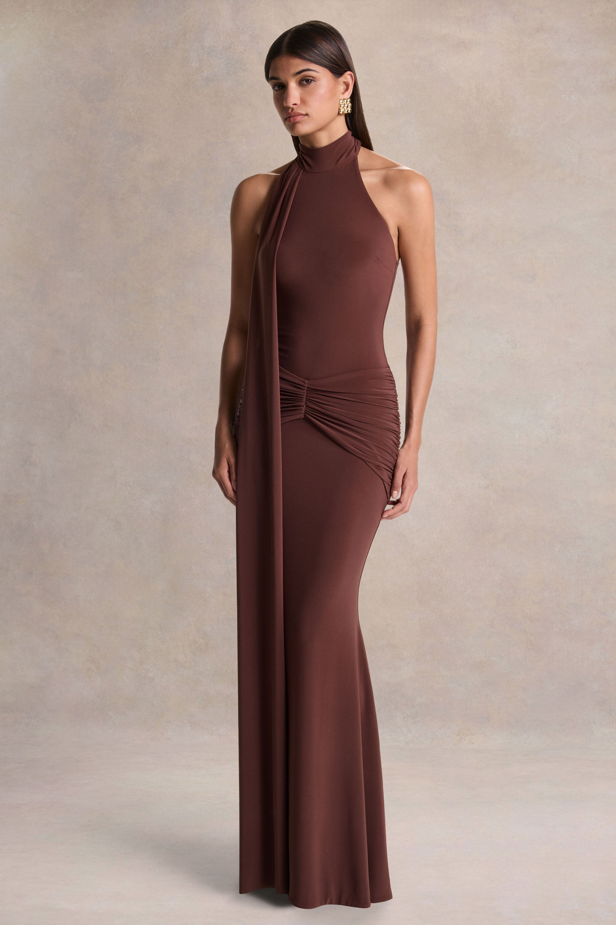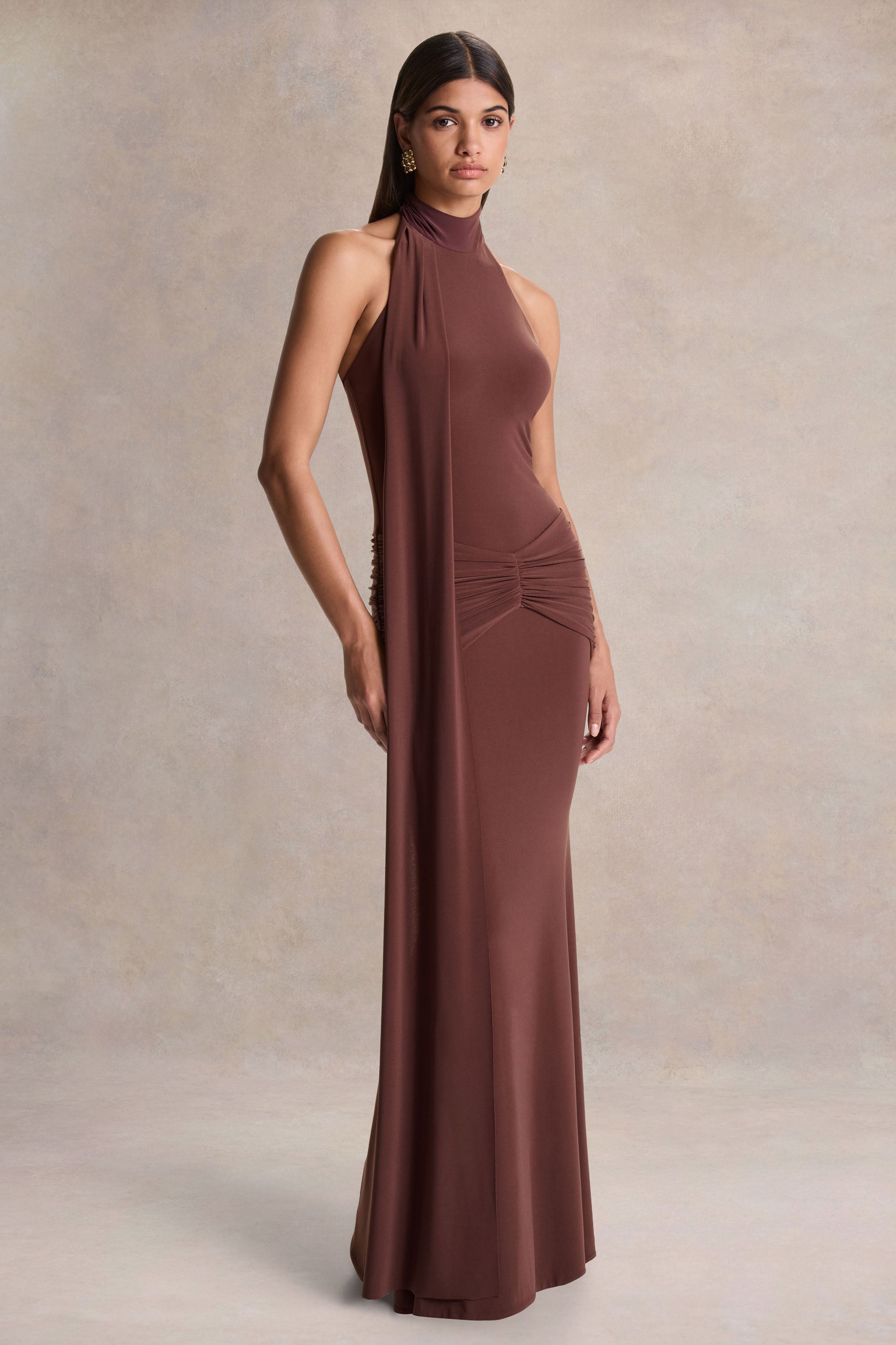 Hyla embodies understated glamour with a beautifully sculpted silhouette. Crafted from our premium brown stretch jersey. this maxi gown contours the body with smooth. effortless elegance. The high neckline offers a clean. refined frame. while gathered detailing and a fluid sash accent create soft dimension and sophisticated movement. Make a memorable entrance this season in Hyla.
