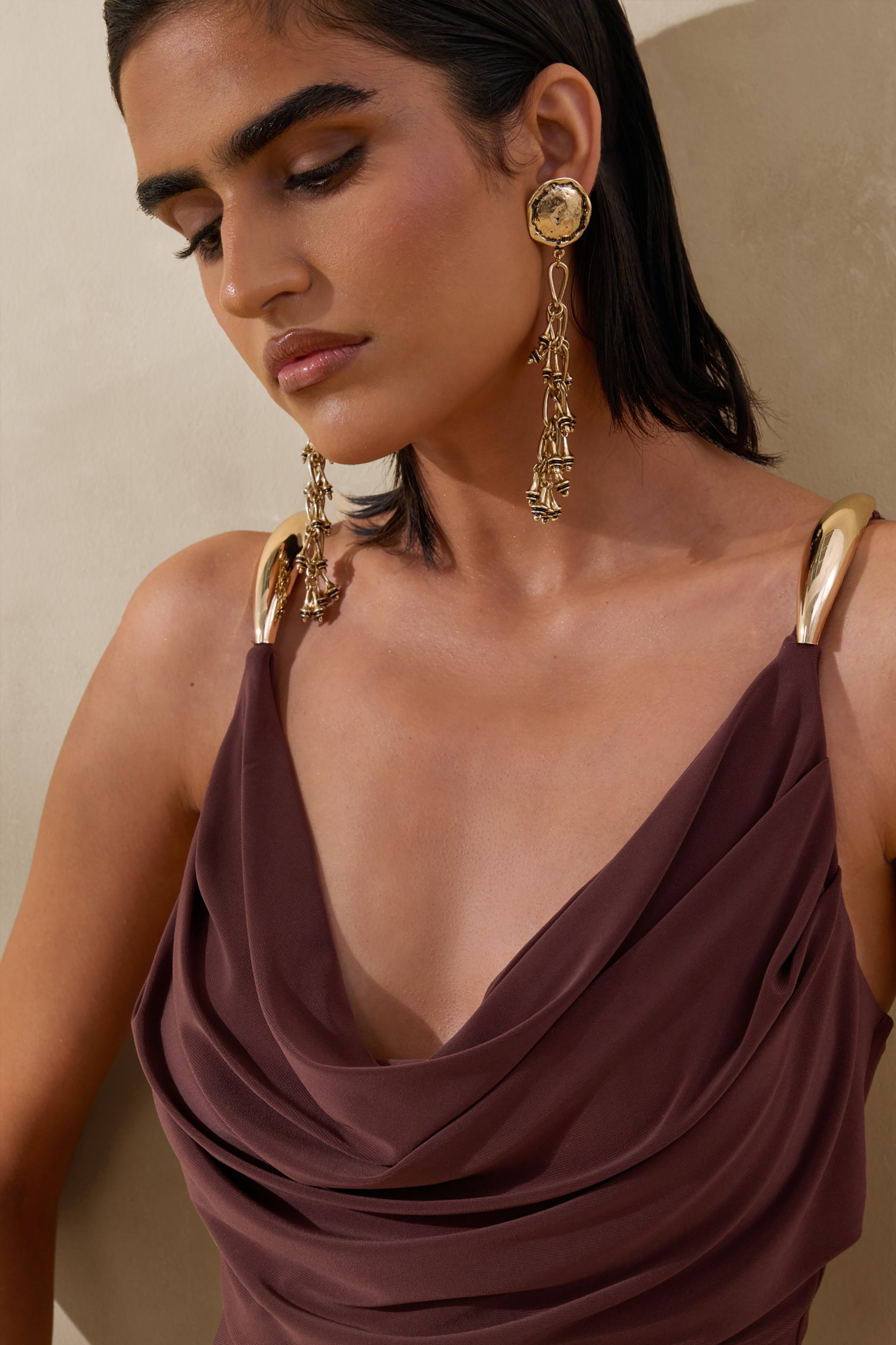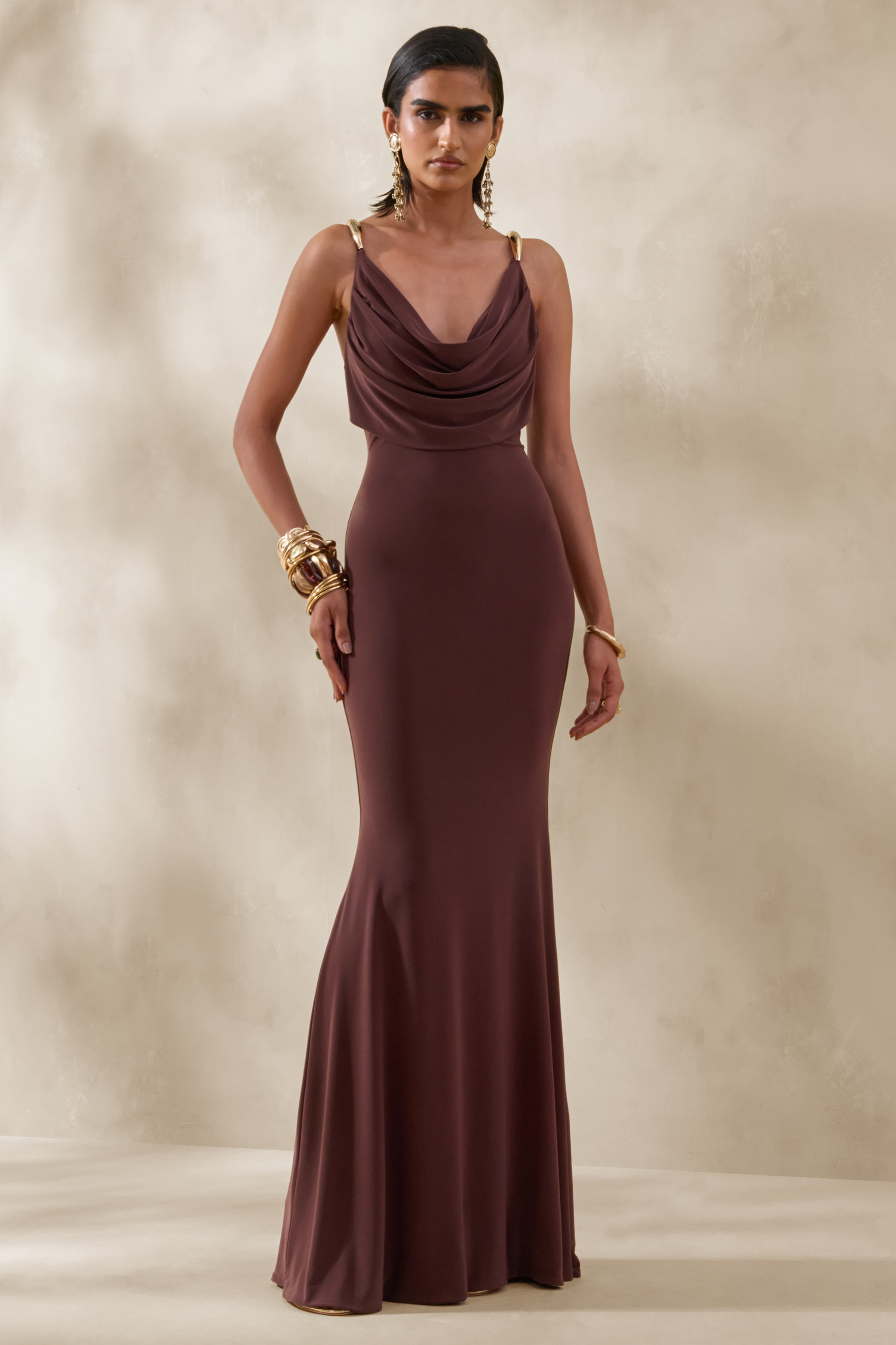 Iridessa embodies effortless seduction with a silhouette that feels both fluid and refined. Crafted from our premium brown stretch jersey. it skims the body with soft. figure-loving drape. The plunge neckline creates striking definition. balanced by adjustable straps for a perfected fit. Falling into a sleek maxi length. Iridessa is designed for moments that call for understated yet unforgettable glamour.