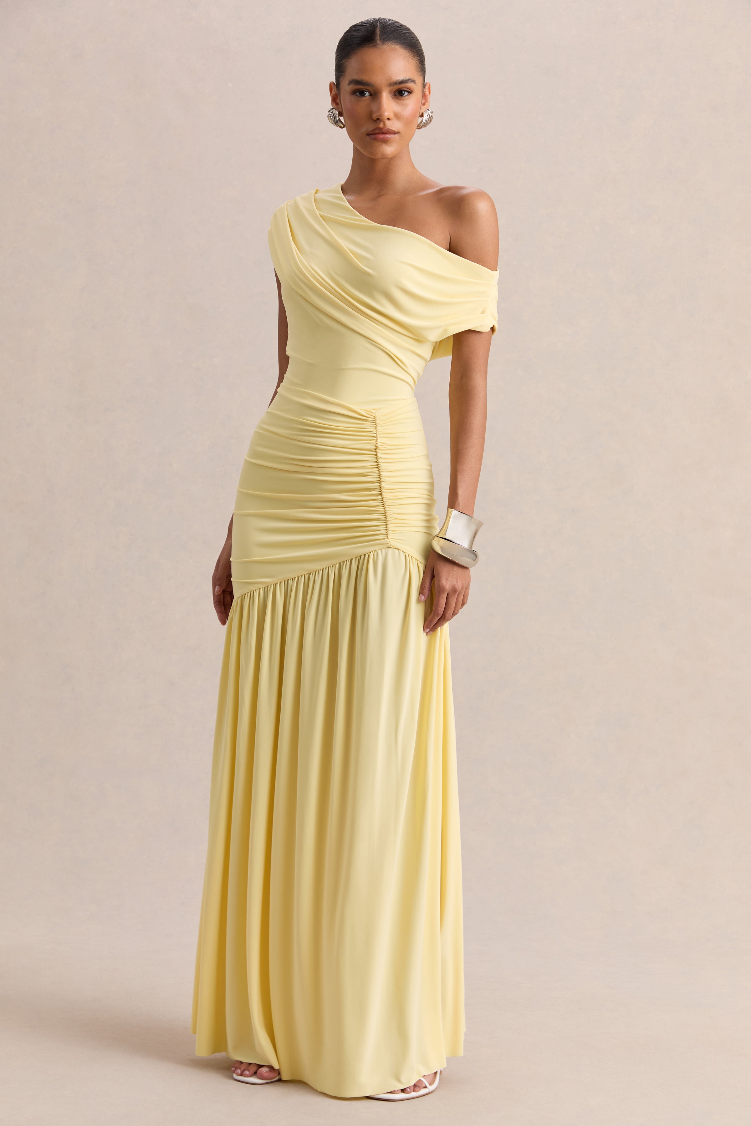 Chic. sculpted. and effortlessly striking. Kady is designed to make an entrance. Crafted from premium stretch jersey in timeless lemon. this maxi dress hugs and drapes in all the right places. ensuring high-impact style. The asymmetric neckline and blouson bodice create a soft. flattering shape. balanced by a ruched detailing that defines the silhouette. Kady moves with confidence and allure. perfect for evening events that call for understated drama.